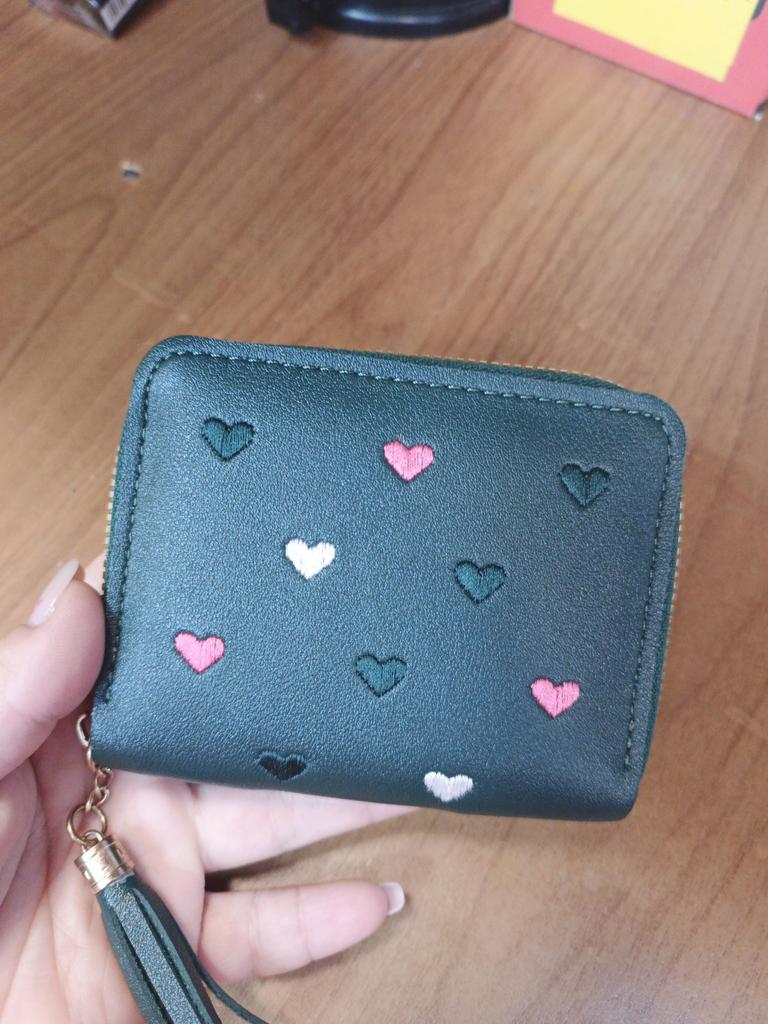 Je to velmi praktická a hezká koženková peněženka s vyšívanými srdíčky, moc se mi líbí.