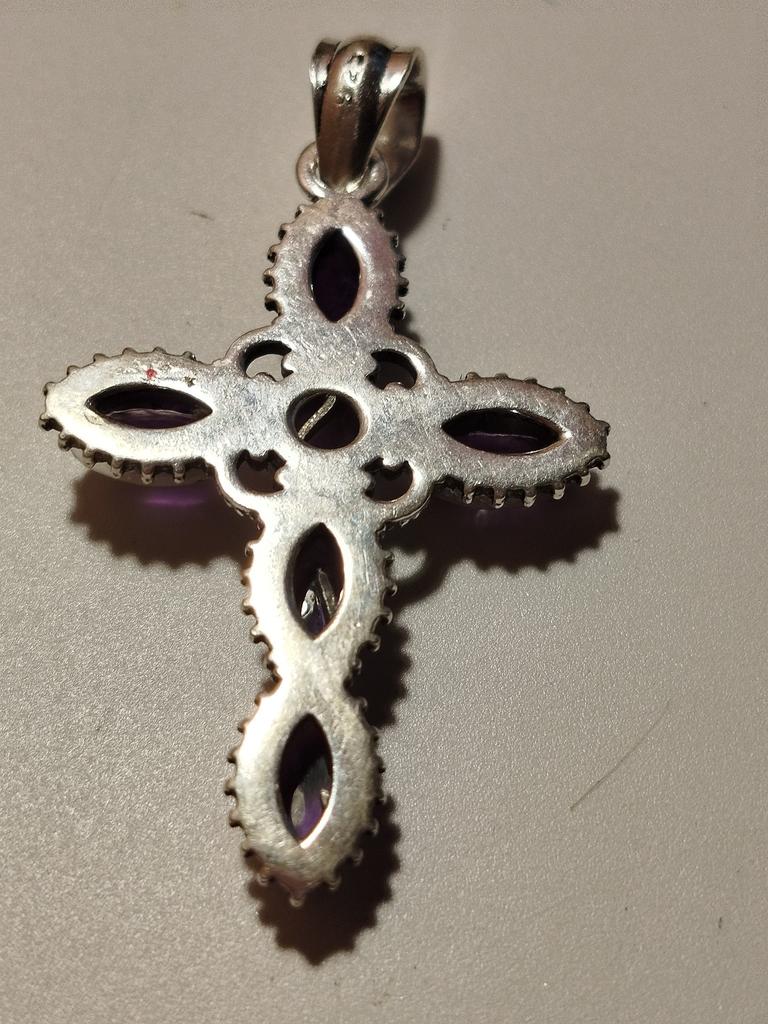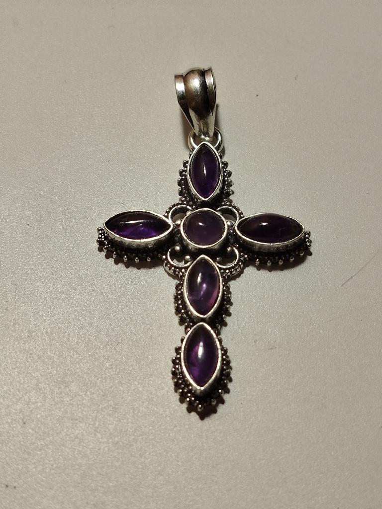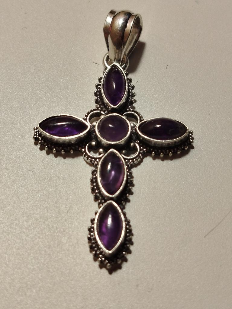 Ručně vyráběný dárkový kříž ze sterlingového stříbra 925 s přírodním šalvějovým ametystem, 1,81" K8O77