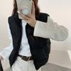 The single-breasted design features pockets and a casual, loose fit for a simple yet fashionable look.