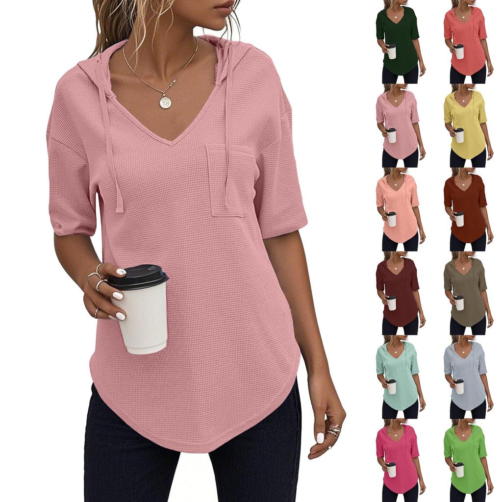 Women's Fashion Summer V-Neck T Shirt Drawstring Hooded Solid Color Short Sleeve Top