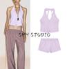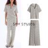 Linen Blend Stripes V Neck Short Sleeve Shirt 8084669 Simple and Comfortable Stripes Casual Pants 8100669