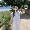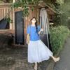 Kumikumi Vacation Set French style Polka Dot Puff sleeve Shirts Women Summer Loose Blue Skirt Two-piece Set