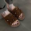 Fashion retro niche rhinestone flower matte suede one-word drag women comfortable stepping on shit cool slippers