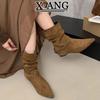 Cowhide version pleated stacking boots pointed inner heightening short boots Martin boots women's belt buckle medium boots thin boots