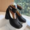 Vintage Spring Fashion Slipt Toe Tabi Women Pumps Chunky Round Heeled Ankle Strap High Heels Patent Leather Party Shoes