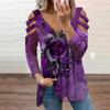 Fashion Womens Loose Collar Zipper V-neck Rose Print Long-Sleeved Casual T-shirt
