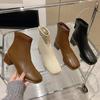South Korea Dongdaemun thick heel square head short boots women's zipper leather Internet celebrity boots versatile Korean women's leather boots