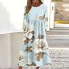 Women's Casual Round Neck Floral Print Midi Dress Long Sleeve Pocket Dress