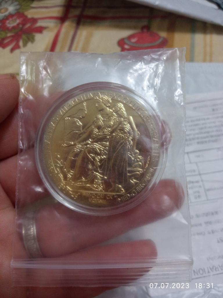 Great coin, arrived well packaged. Very heavy, well made and shiny. Recommended. Thanks