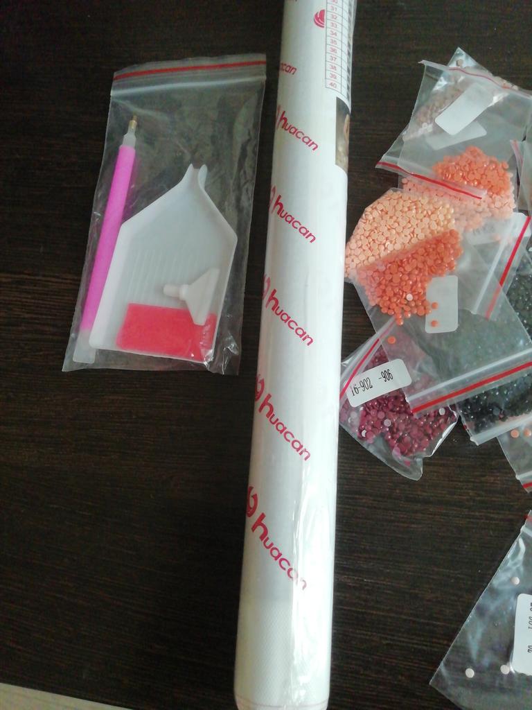 Package includes: 1Pc x embroidered cloth, 1Pc x point drill pen, 1Pc x plastic tray, round stone bag x round resin rhinestones