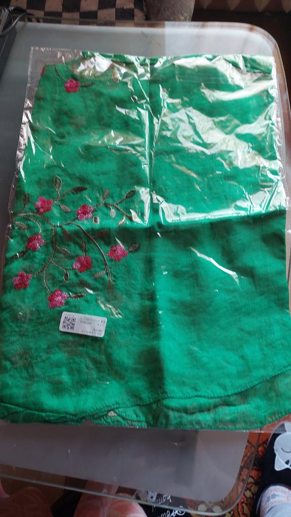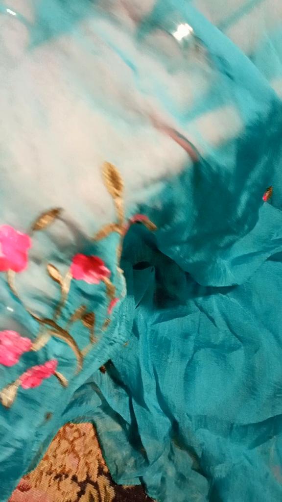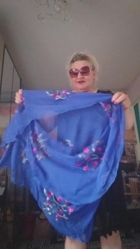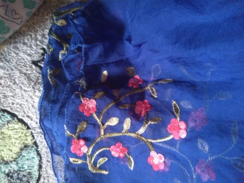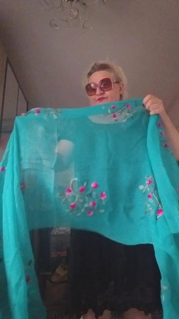 It's blue. And black very thin chiffon beautiful embroidery. You can wear it as a scarf around your neck or whatever you like. Whoever likes it. Thank you very much everyone
