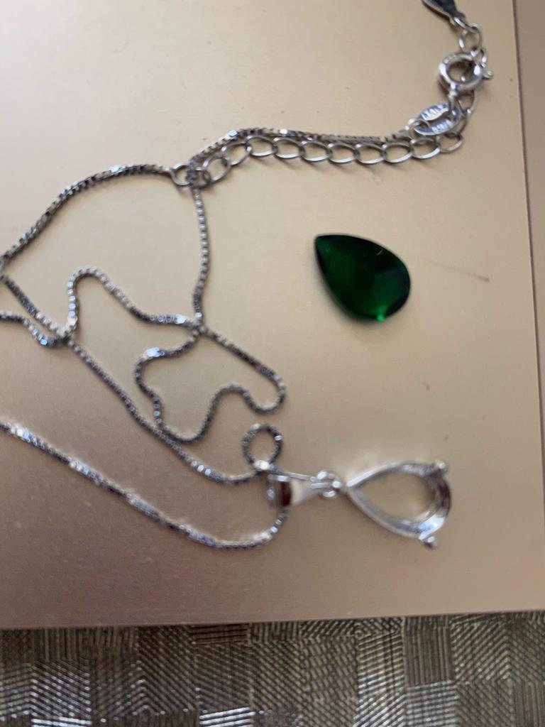 The order was delivered in 19 days as a registered mail and was well packed in a bubble envelope. In addition, the goods were packed in their own box. This is a beautiful real silver necklace from the brand "Umcho" with a really beautiful, teardrop-shaped pendant, which is made of a great dark green stone. The chain is made of 925 sterling silver, as is the version of the pendant, and is very delicate and smoothed. The workmanship is very high quality and filigree. The stone is modeled on a drop and cut very nicely. The green is very dark and sparkles very intensely in the light. It is exactly the same stone as the earrings and ear studs, which I have already ordered and reviewed to match. Together it's a great set. The frames are great and nothing falls out. The chain is closed with a sliding clip. Everything is working fine. Overall I am very satisfied with the product and the seller and would be happy to recommend both.