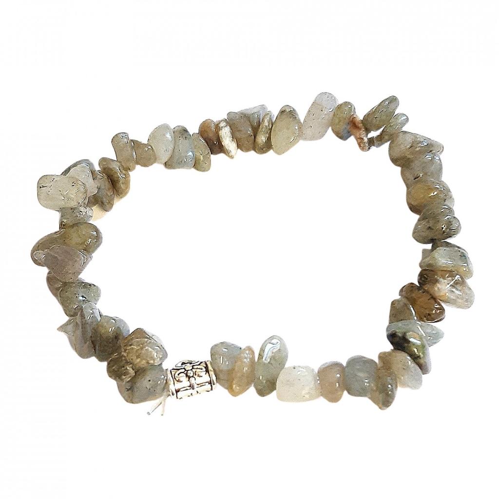 Model: Unisex bracelet for women, men or children adorned with natural labradorite chips and a silver charm