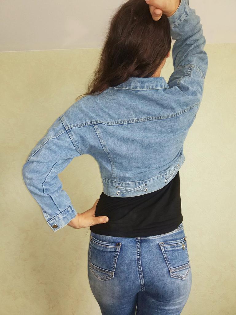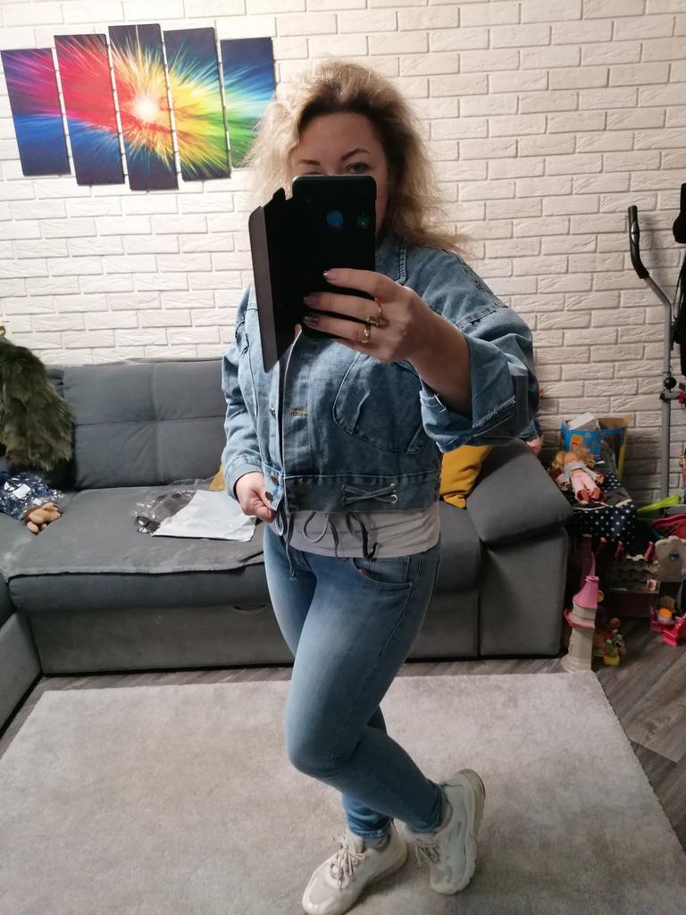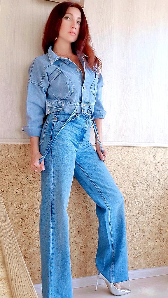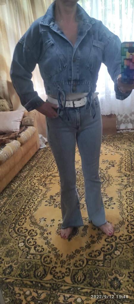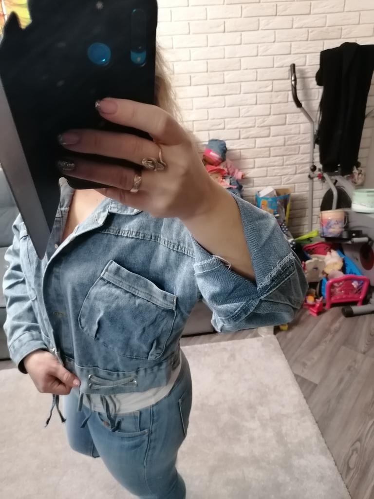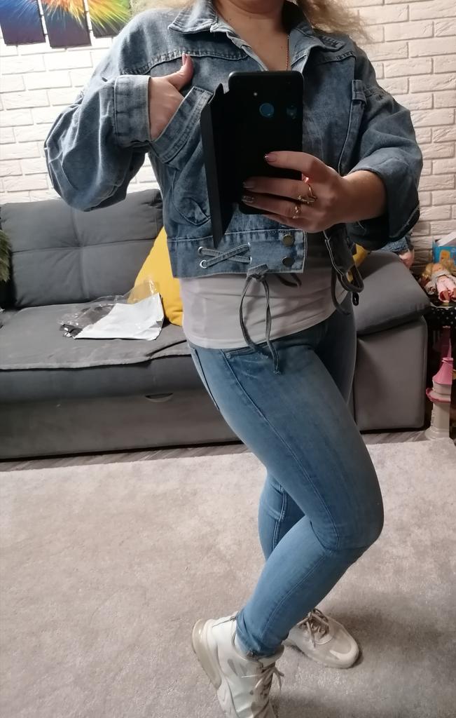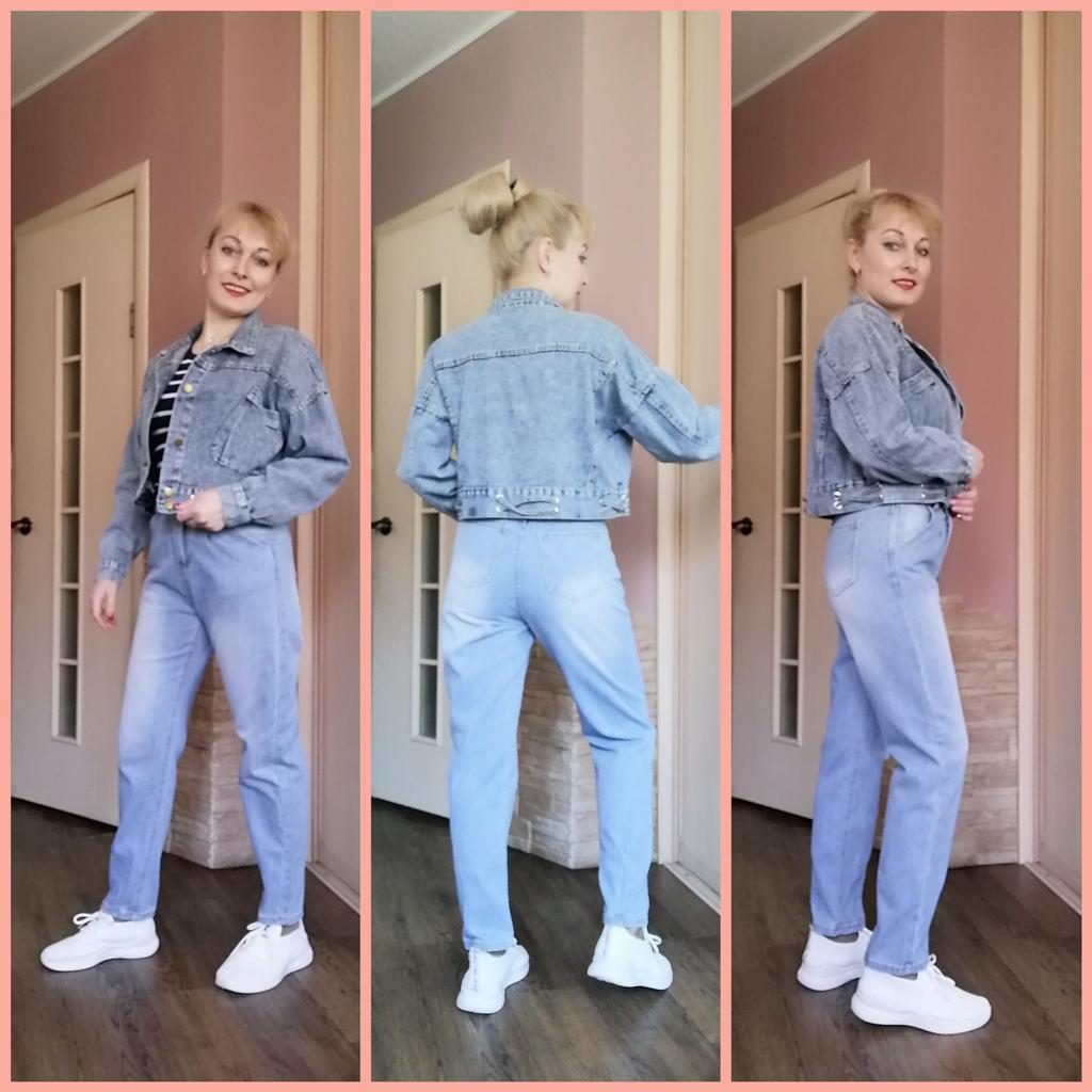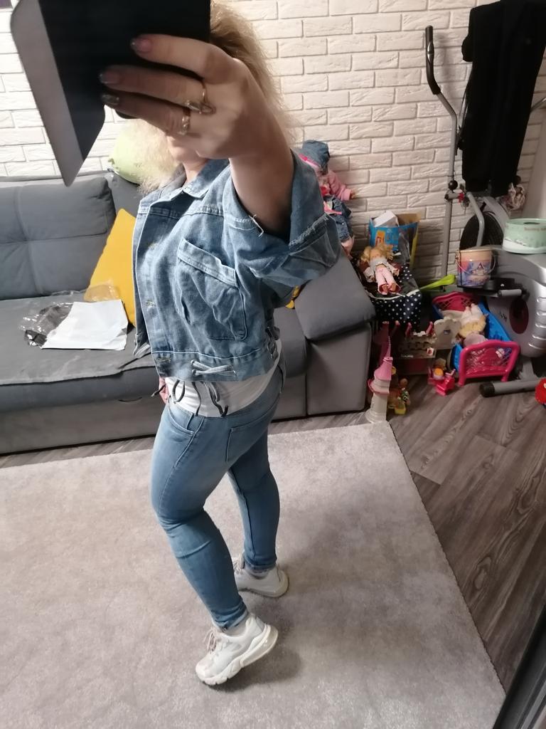 Nice fashionable denim, cropped. I took L and it sits very loosely at 90-70-90, like Overseas, I like it. You can also wear it over a sweatshirt or sweater, it wonβt be too tight. The jeans are thin. The smell is strong, I hope it goes away after washing