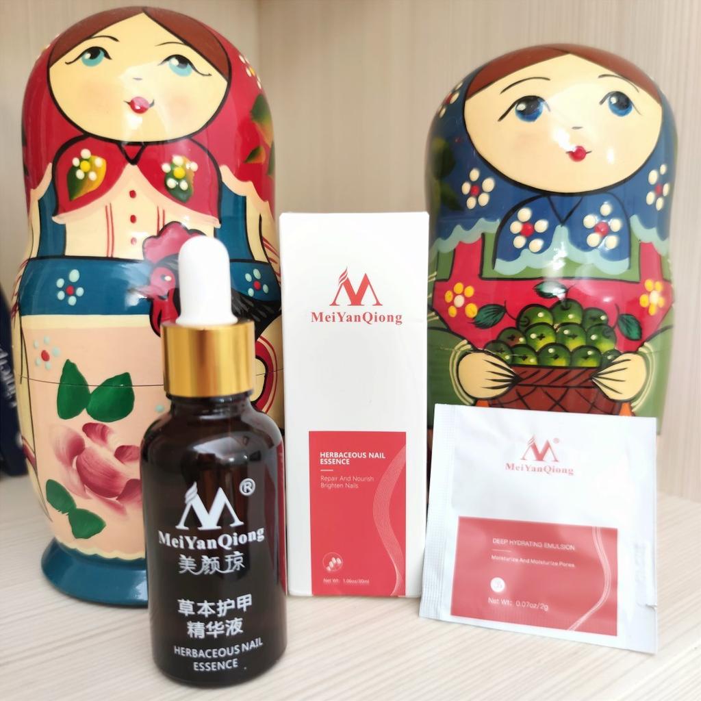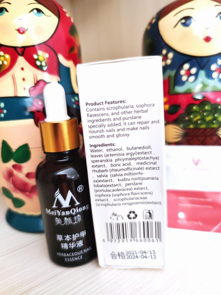 HERBAL NAIL ESSENCE by MeiYanQiong ! ❤️ EFFECTS: Rich in Sophora and other herbal ingredients,can repair damaged nails deeply,soften cutin and exfoliate skin gently,without damaging the surface of nails, keep them in a natural,smooth,and healthy gloss. INGREDIENTS: Water,ethanol,butanedioll,leaves (artemisia argyi) extarct,speranskia (phrymaleptostachya) extarct,boricacid,medicinal rhubarb (rheumofficinale) extarct,salvia (salvia miltiorrhiza) extarct,kudzu root (pueraria lobata) extarct,perslane (portulacaoleracea) extarct,sophora (sophora flavescens) extarct,scrophulariaceae (scrophularia ningpoensis) extarct. USAGE METHOD: After cleaning and drying,apply the product to the nail and dry it after each application,repeat again,recommend to use 2-3 times a day. Delivery took one month to come to Greece. 🇬🇷 Easy to take it with you! Also the seller added some free cream samples for gift! 🎁 100% recommendable 💯 Love it ! ❤️ Thank you & Love you MeiYanQiong and Joom ! ❤