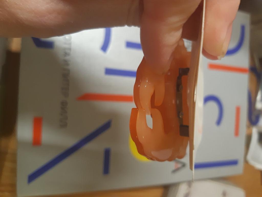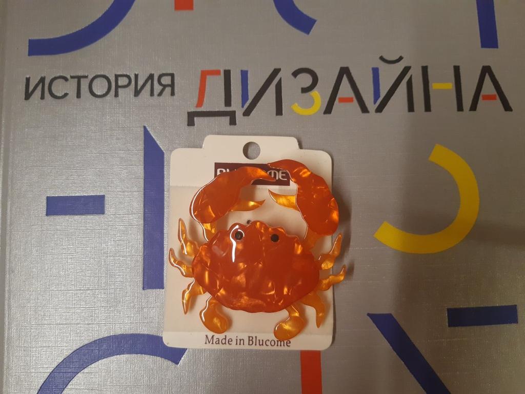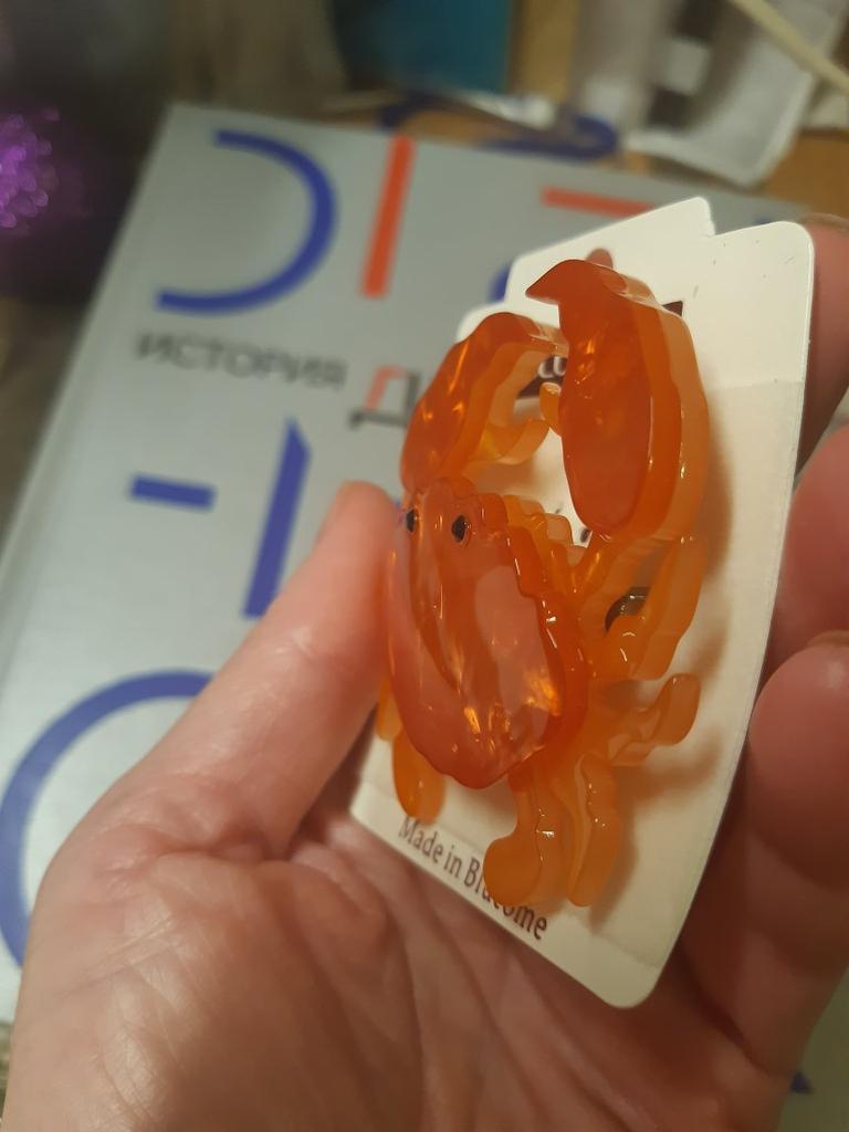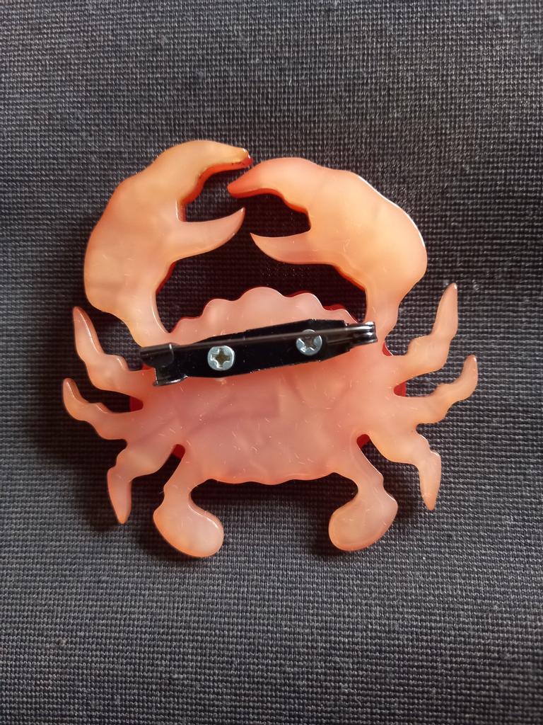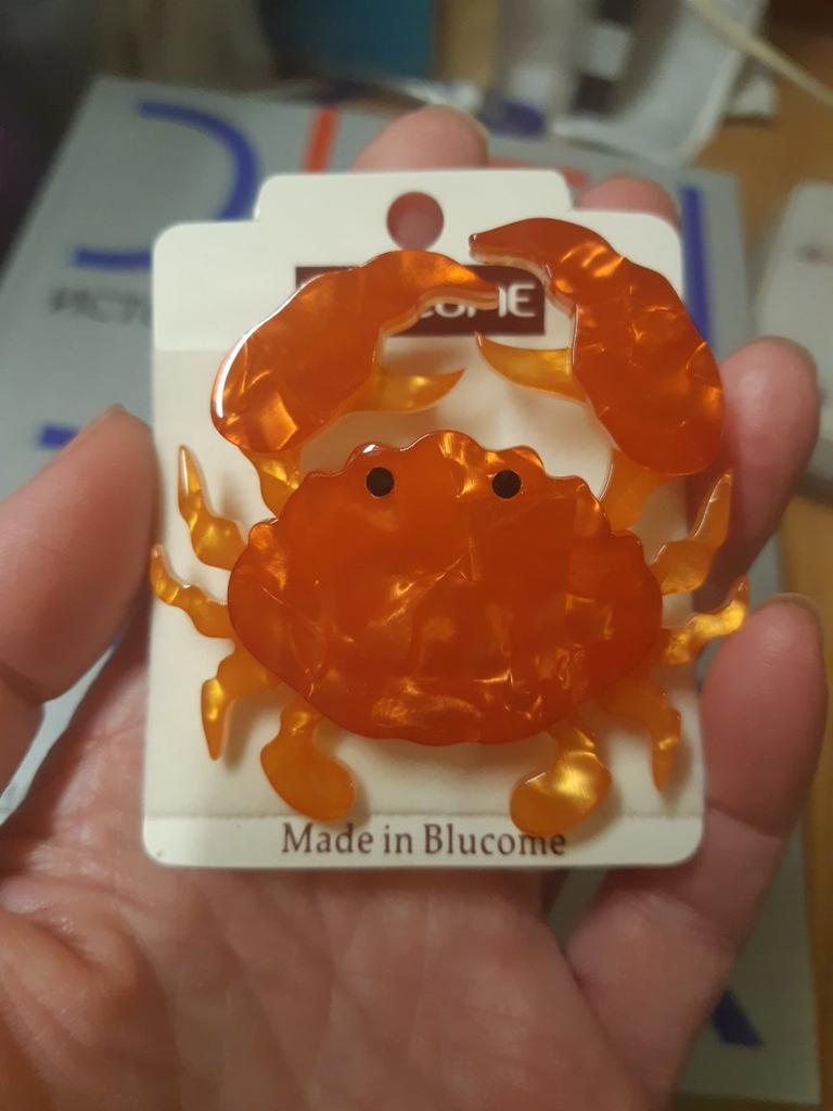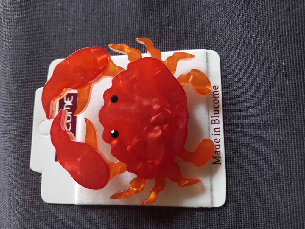 This brooch is gorgeous. It is phenomenally done, the details are super careful. On the back it has a safety pin to hook it wherever you want. The material is shiny plastic and it leaks. It is a beautiful red-orange color.. All edges are smooth and very well finished. I love it thank you seller❤️❤️❤️❤️🦀🦀🦀🦀🦀🦀