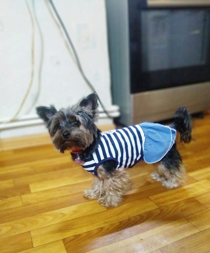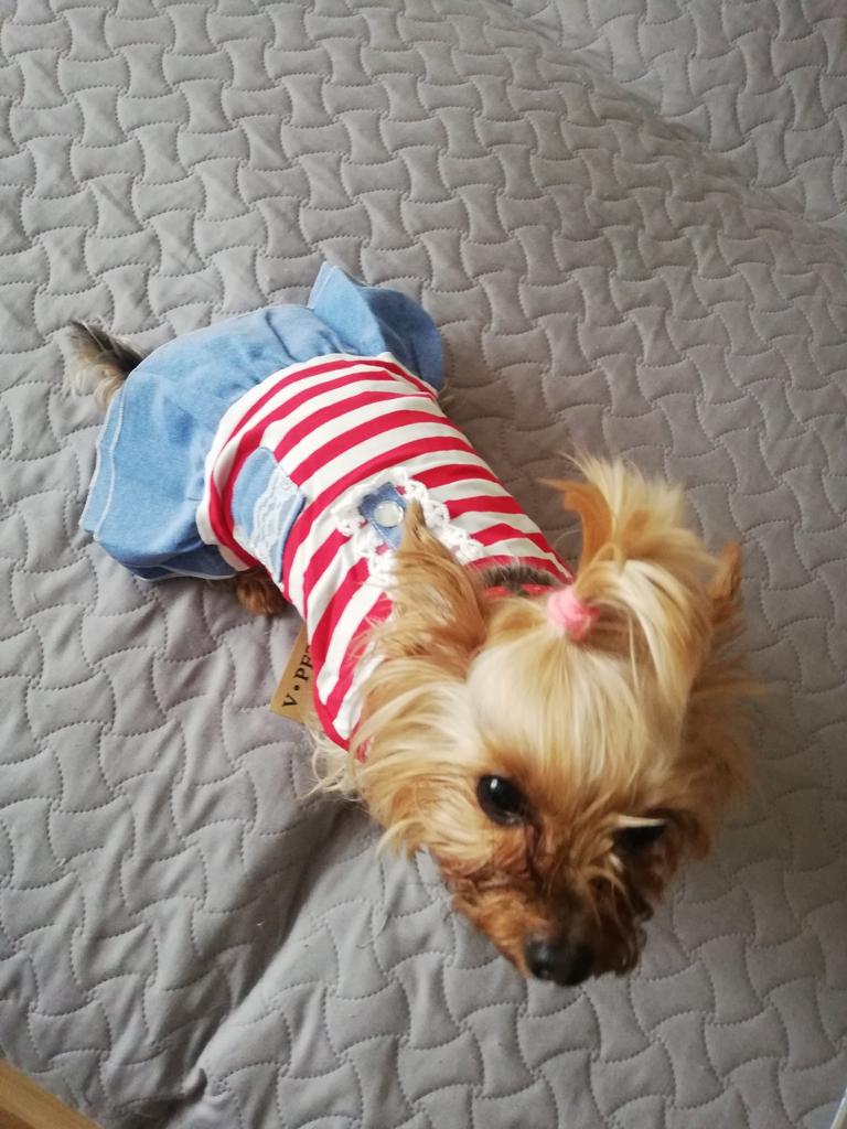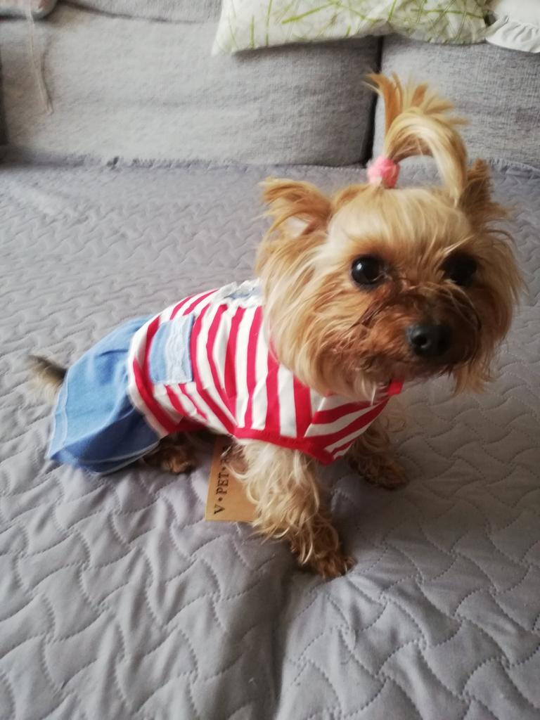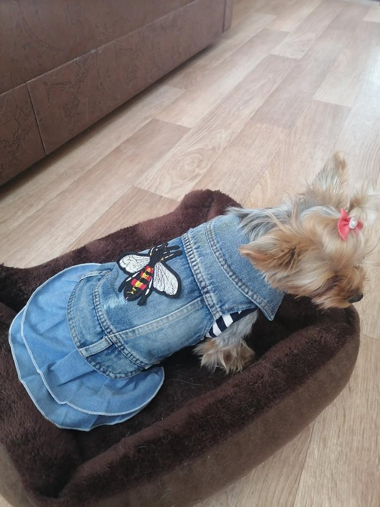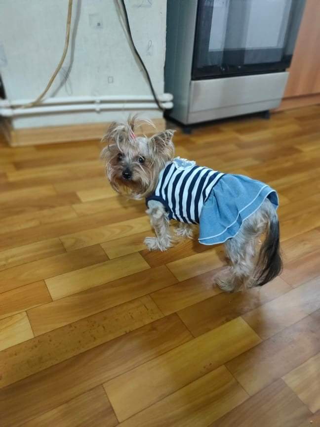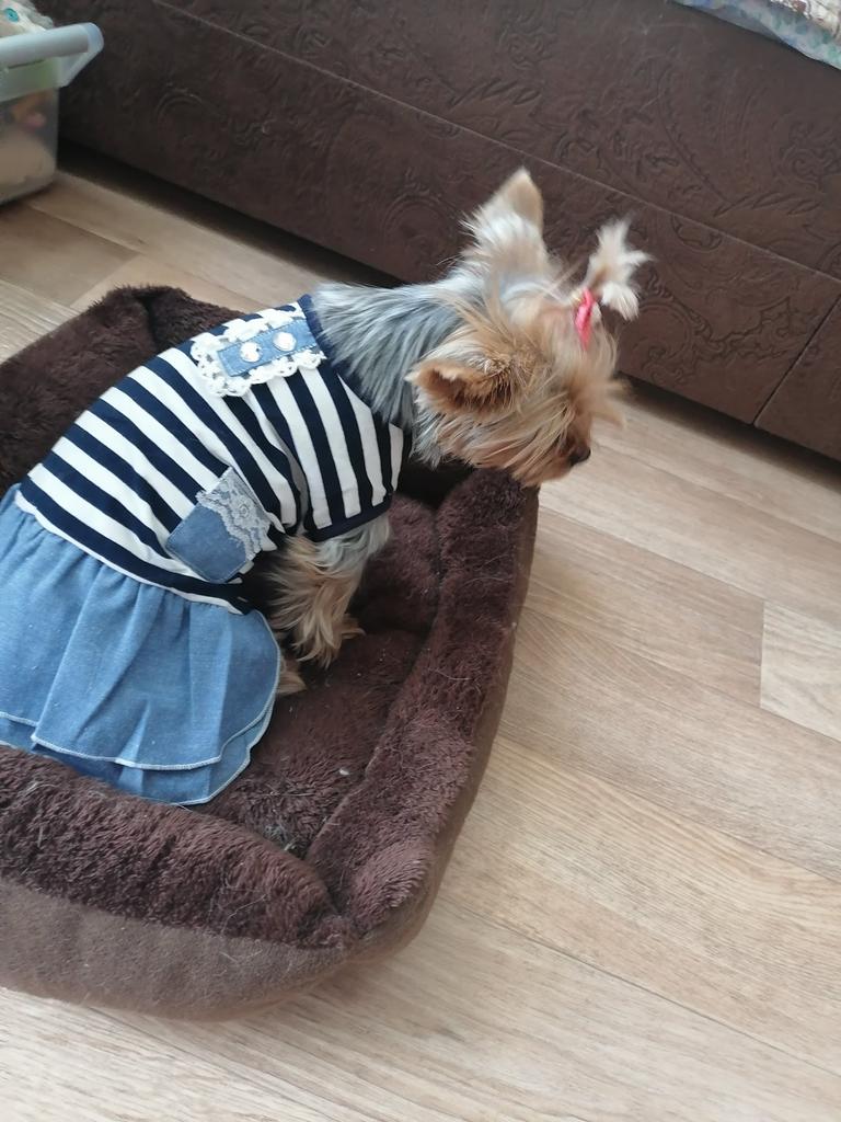 The dress is beautiful, good quality. On a Yorkie weighing 3300, back length 30 cm, just right. A bit wide, but with a harness is good. I have already bought two - with blue stripes and with red ones.