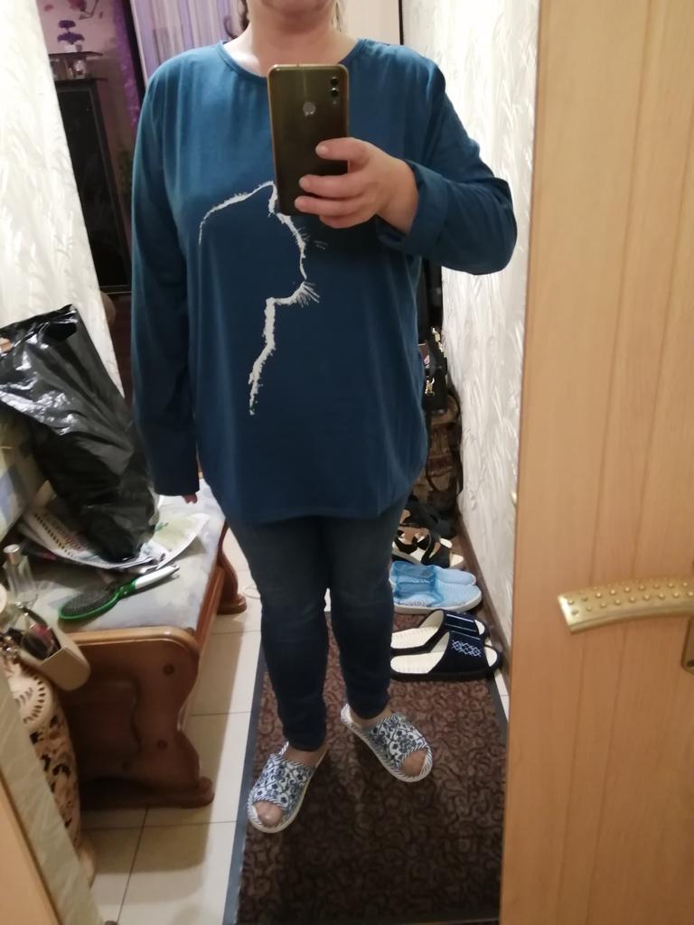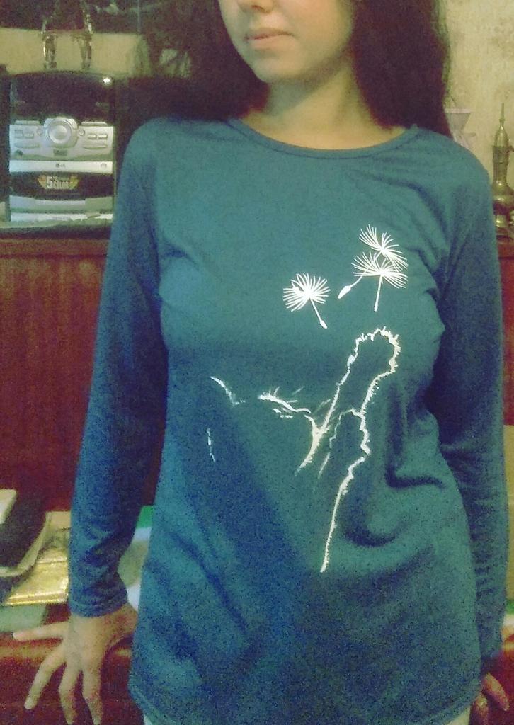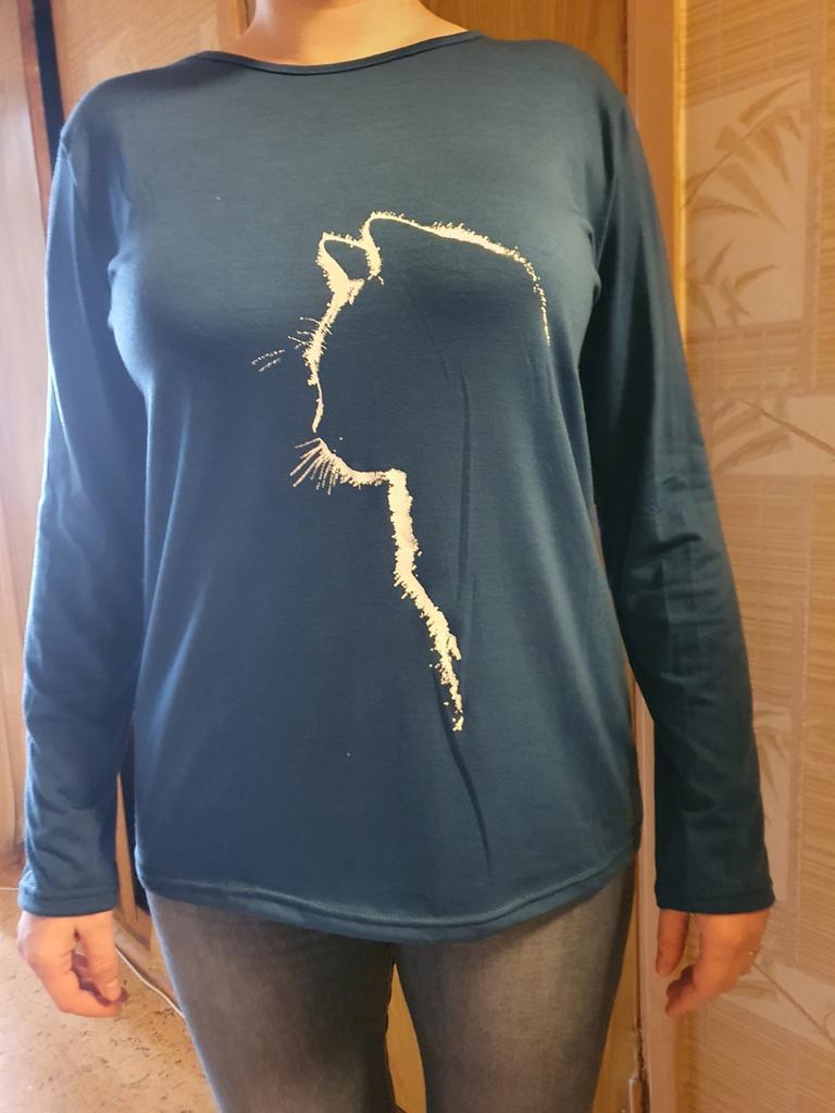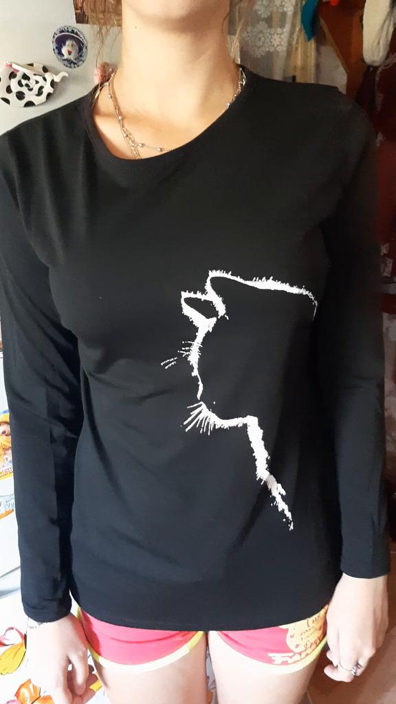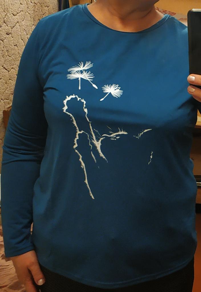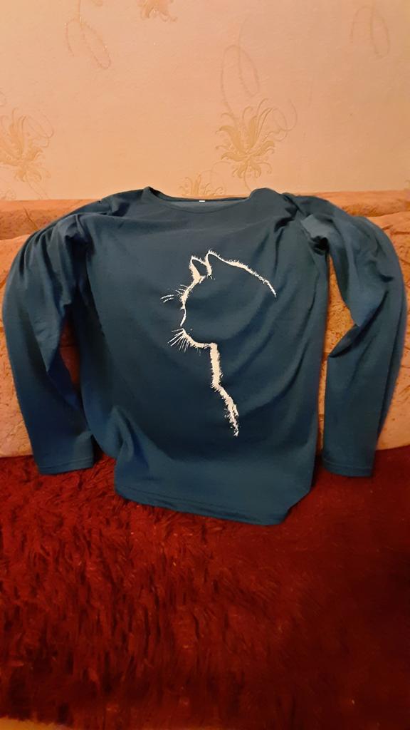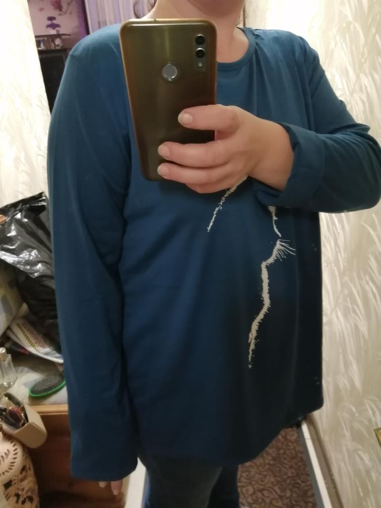 A simple long-sleeved T-shirt. But thanks to the print it is quite suitable for everyday work. Cozy, nice, comfortable