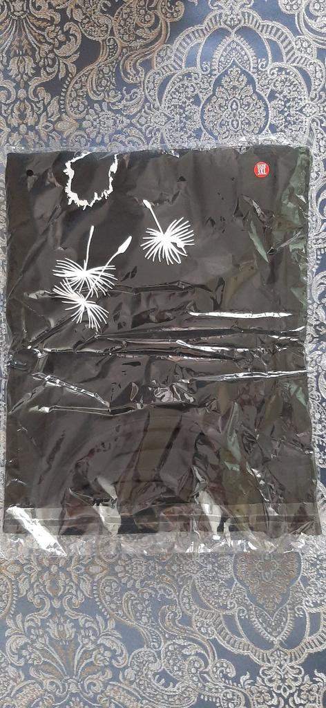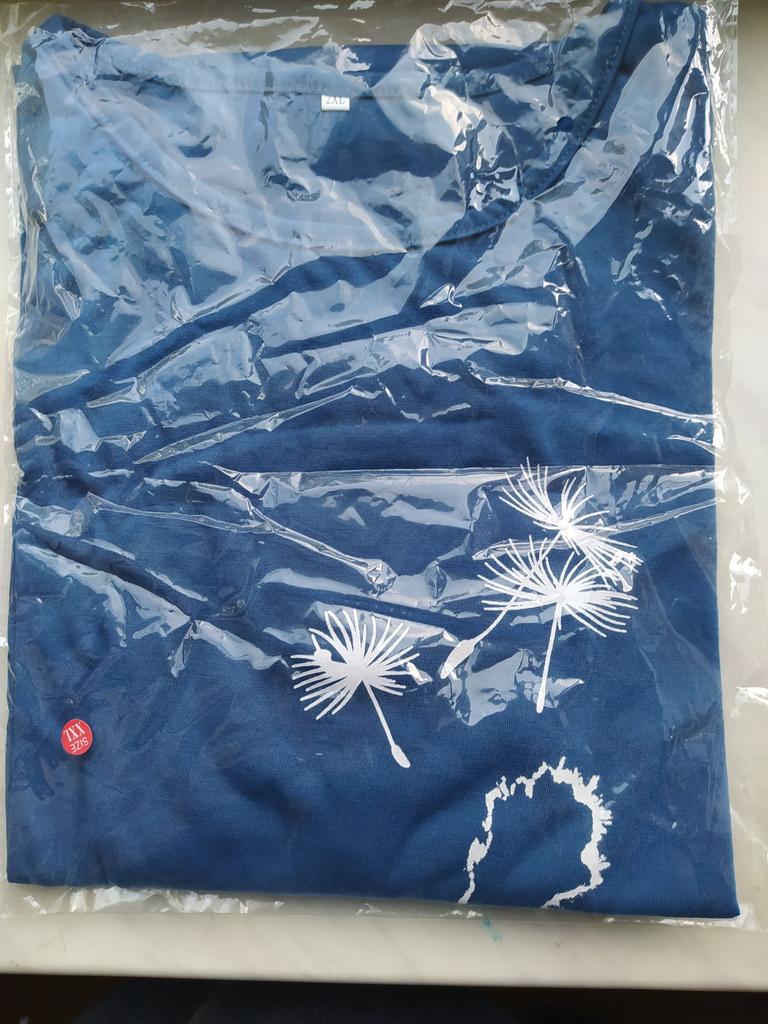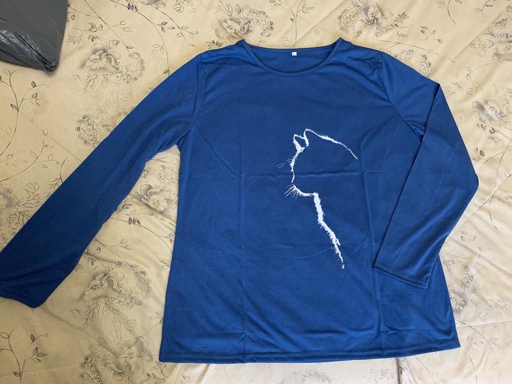 Thin cotton t-shirt. XL is loose on a 46, but could have been smaller. The cat is drawn like a homemade drawing on t-shirts. It will flake off during washing. I wear it at home, and also to the store. It's fine.