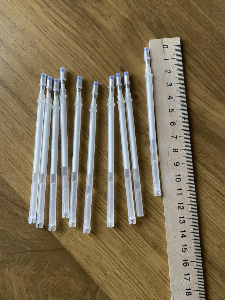 I bought these refills for the first time. These refills are slightly thicker and shorter than the blue ones that disappear at high temperature. I took them to try them out in work. They put in all 10 pieces.