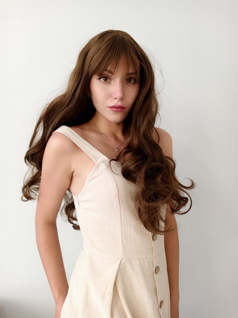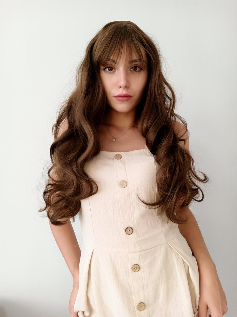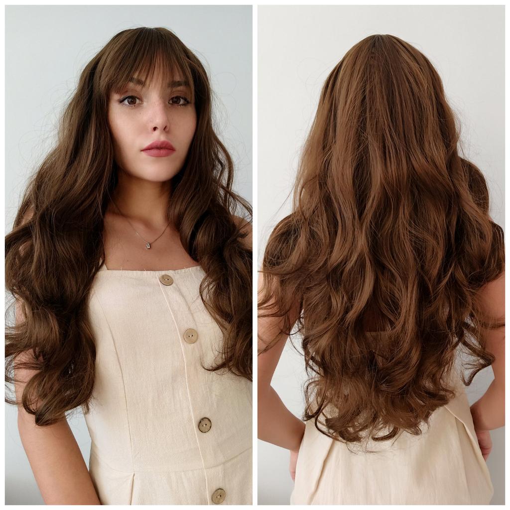 XINRAN Long Wavy Wigs for Black Women African American Synthetic Hair Pink Brown Wigs with Bangs Heat Resistant Wig