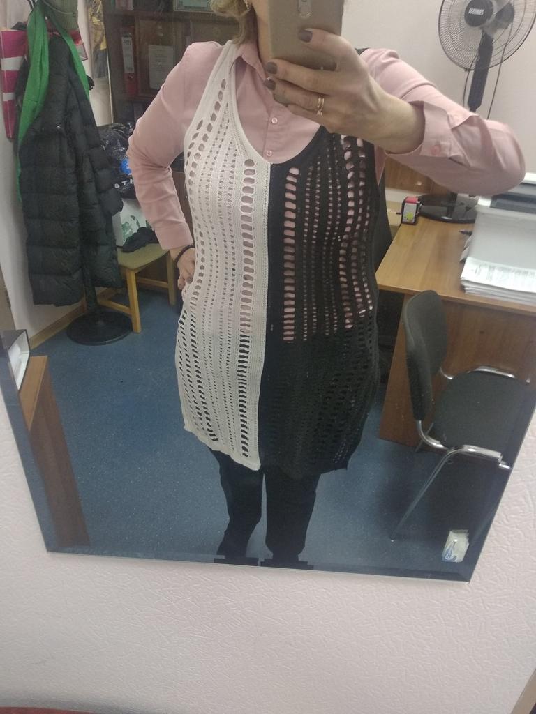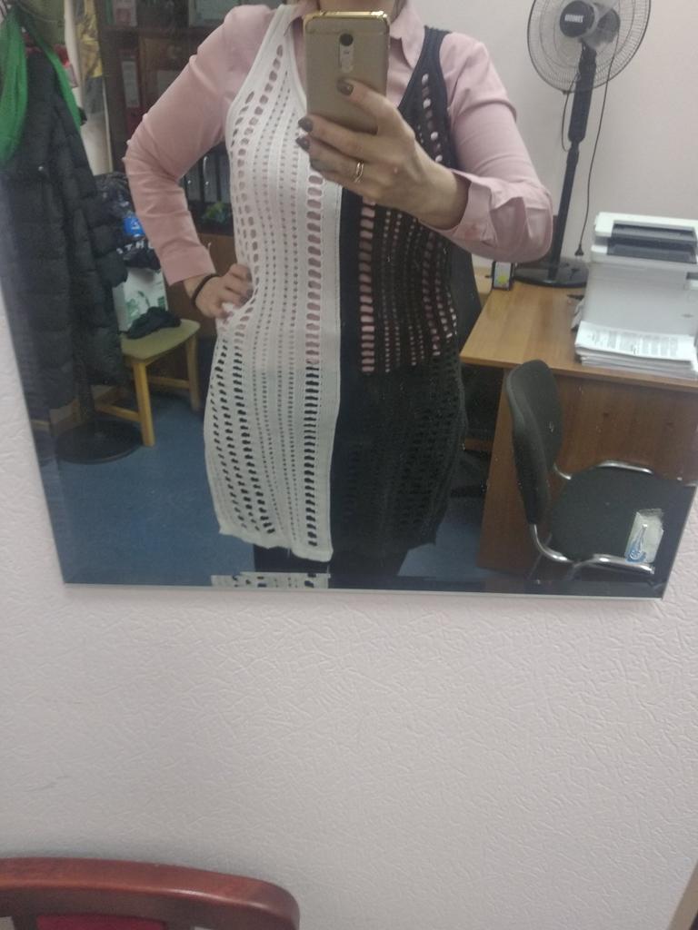 Very pretty beach dress. Slimming in black and white. The composition of the fabric is a mixture of natural and synthetic fibers, but does not soar.