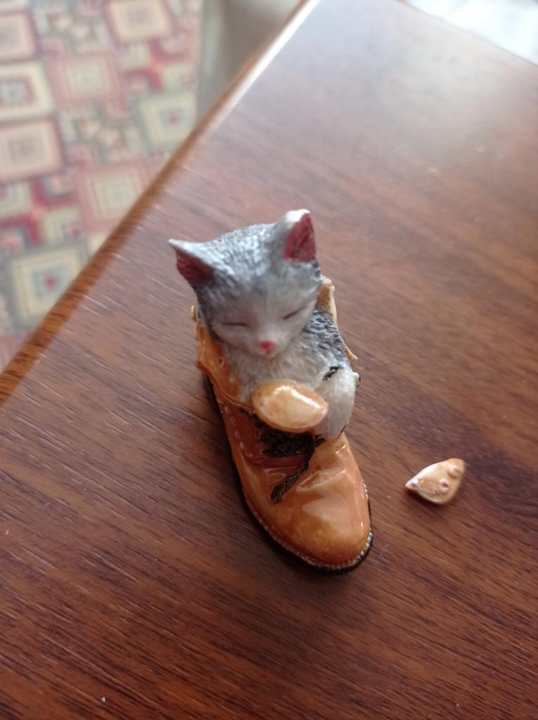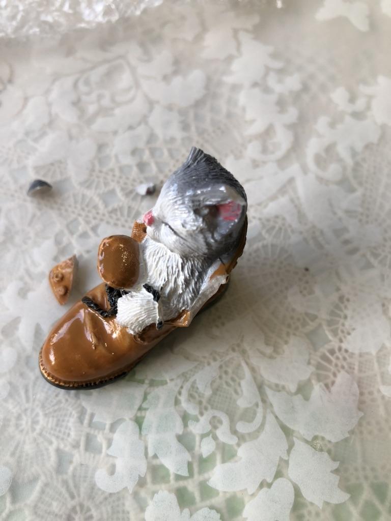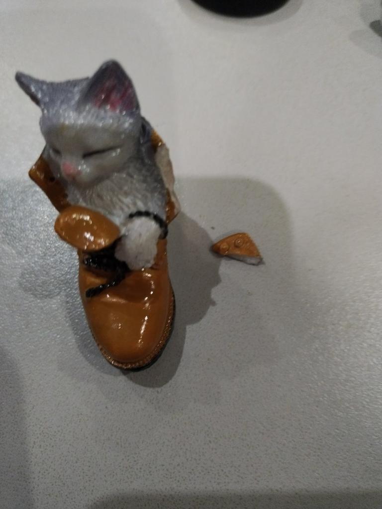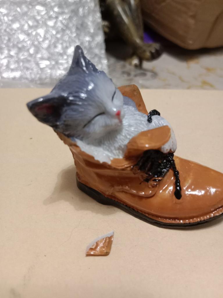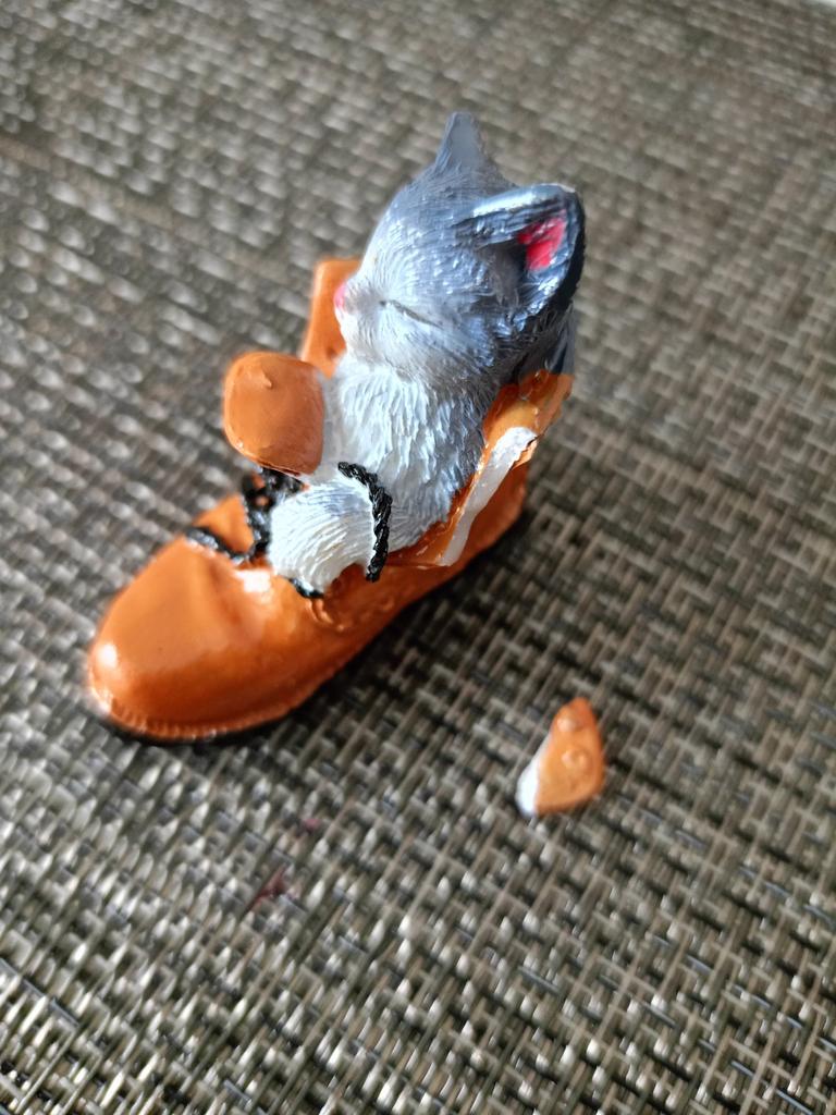 The cat is very cute. But the edge of the boot is chipped off.