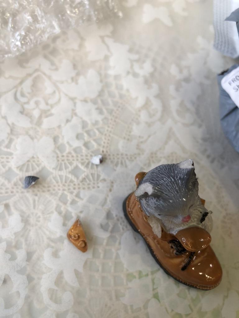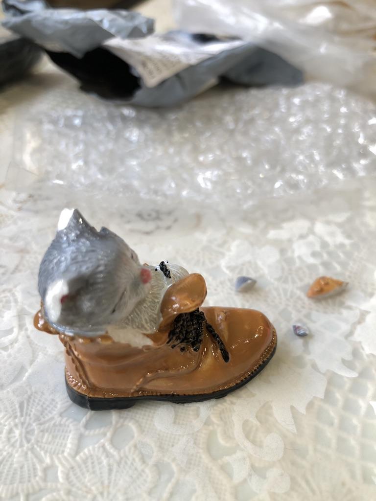 The kitten was poorly packaged and the shoe was broken.