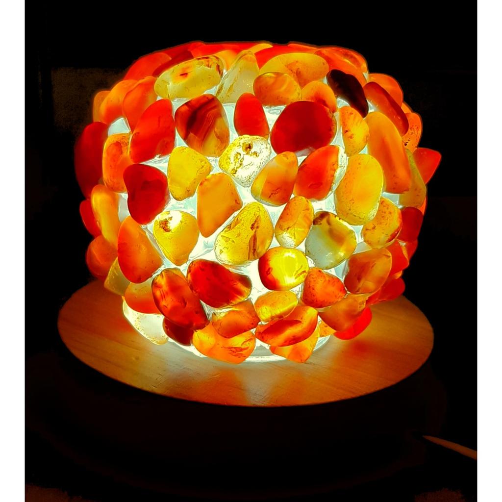 This lamp consists of a glass dome to which cormaline tumbled stones are glued and a wooden base with small LEDs in the middle.