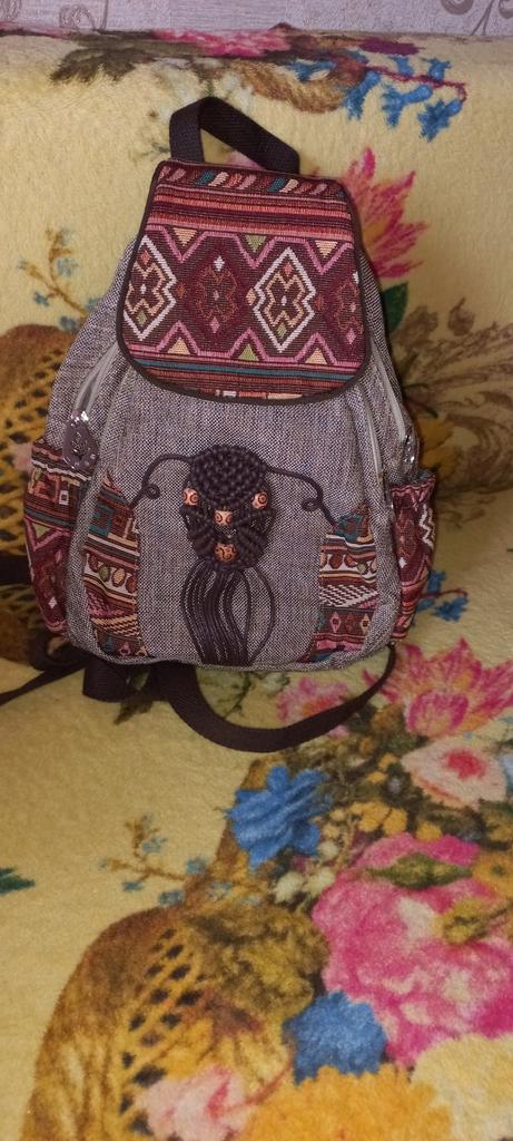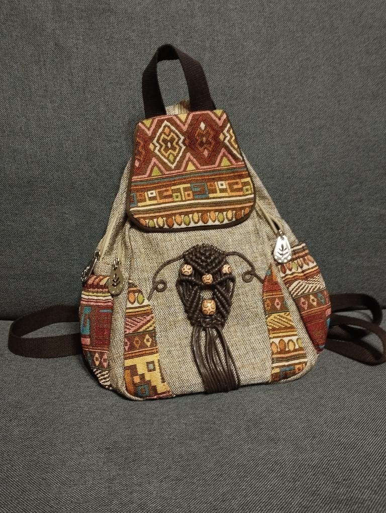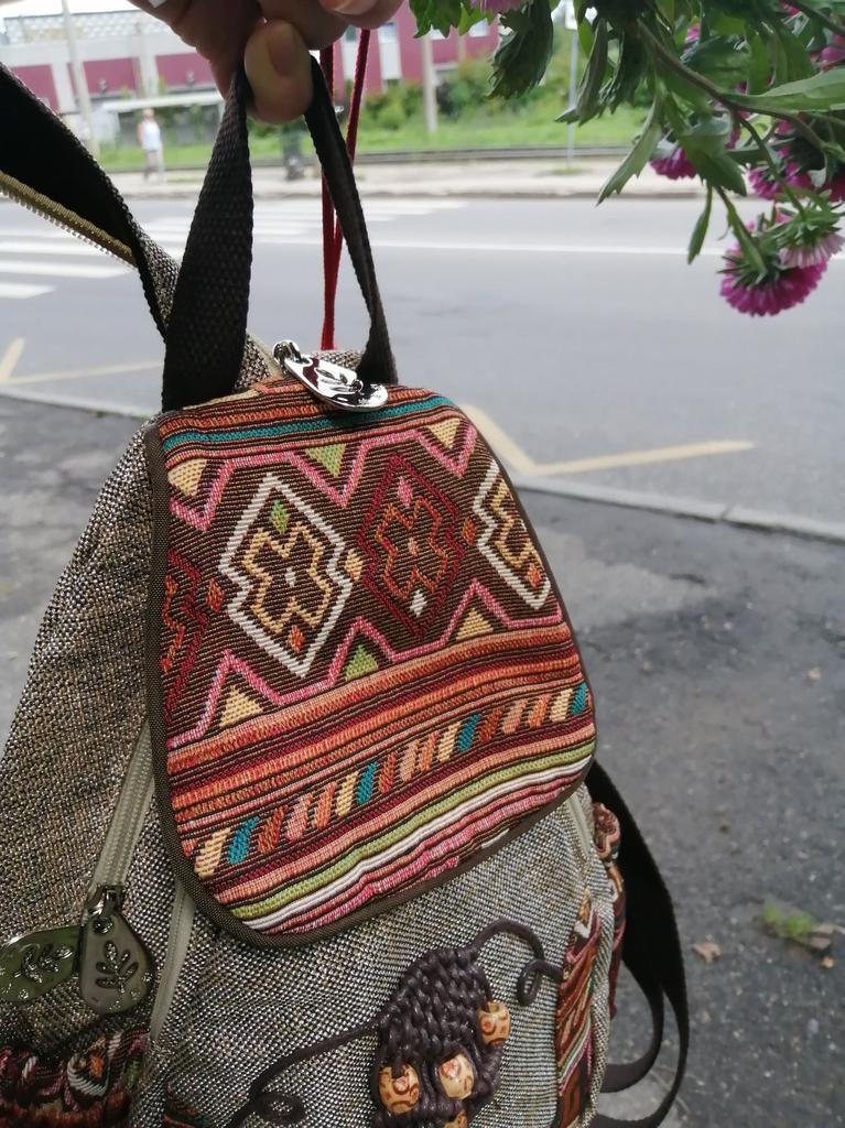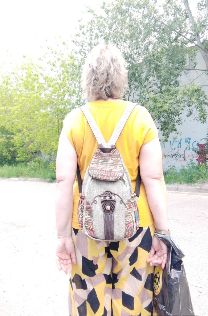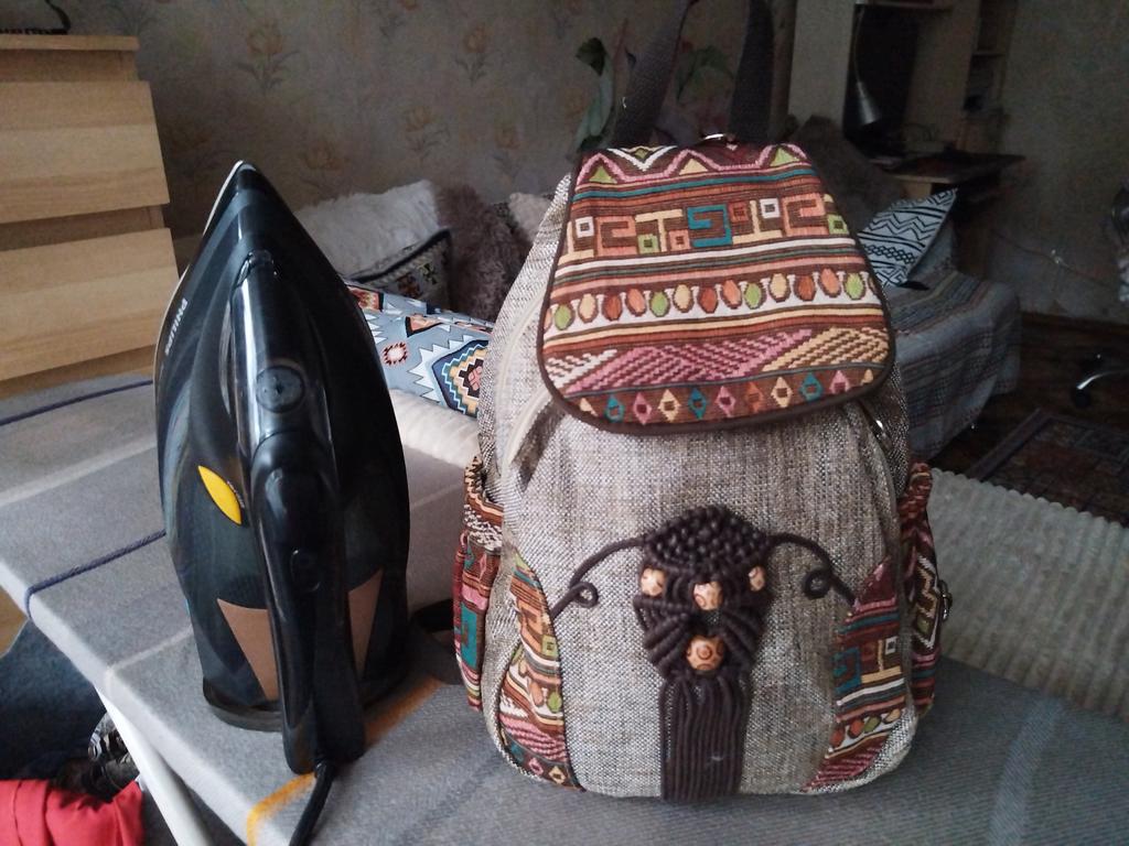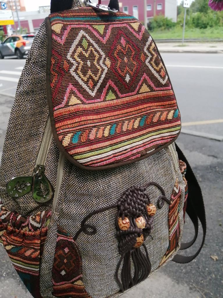 Handmade backpack, roomy, beautiful fabric trim. Two compartments, on the side of the backpack there are pockets for a bottle on both sides. I recommend