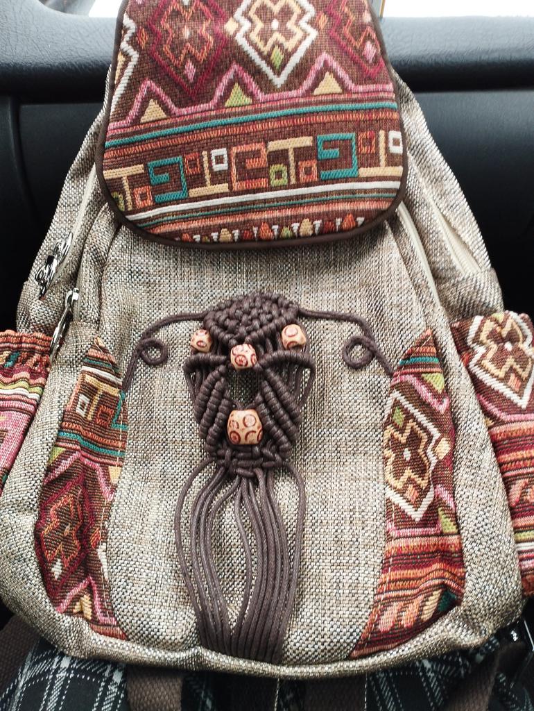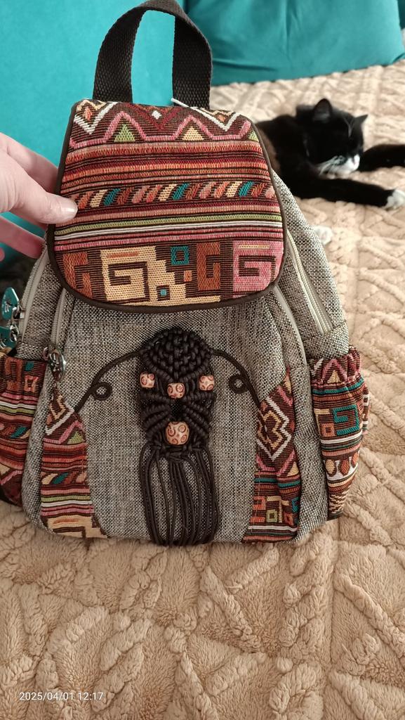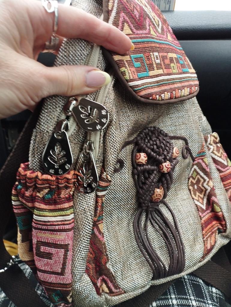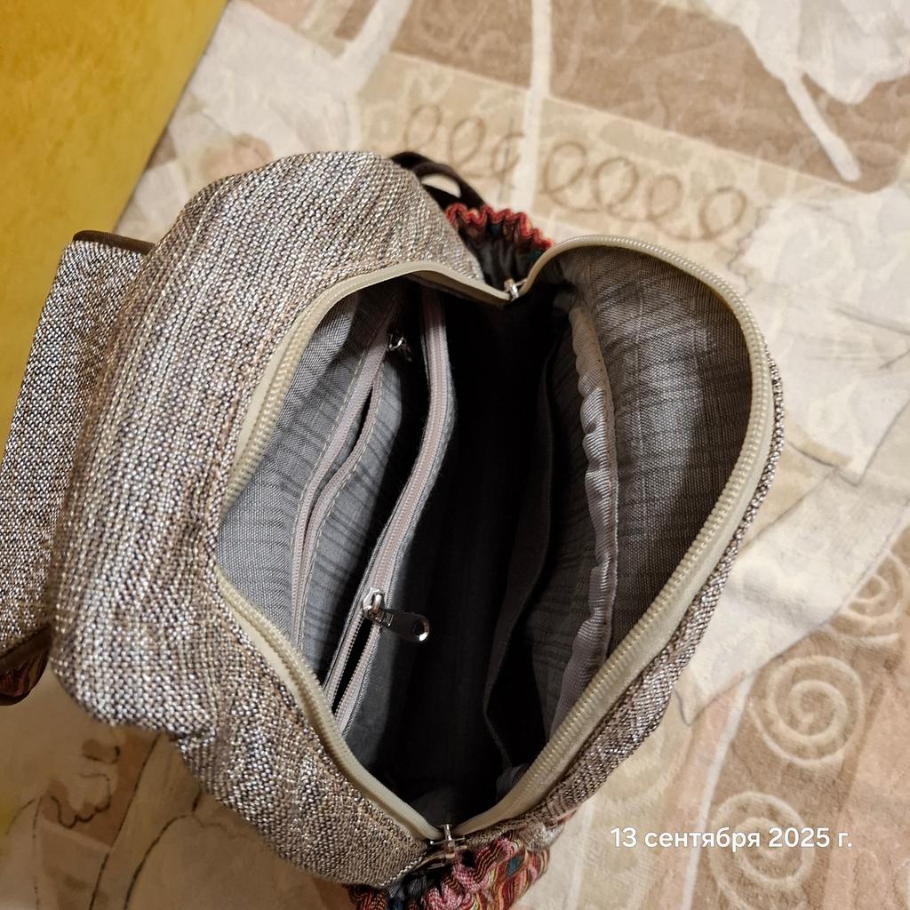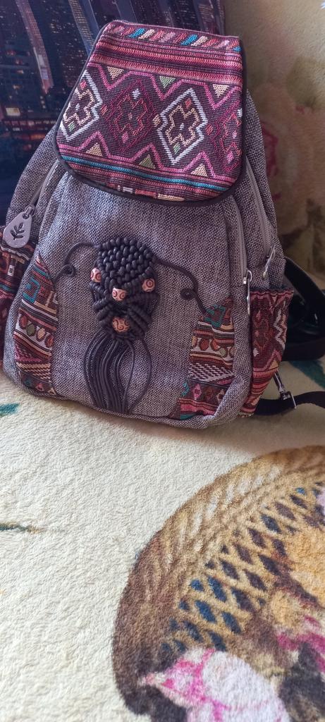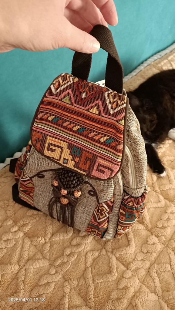 Handmade backpack, roomy, beautiful fabric trim. Two compartments, on the side of the backpack there are pockets for a bottle on both sides. I recommend