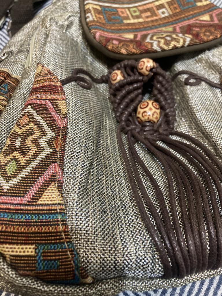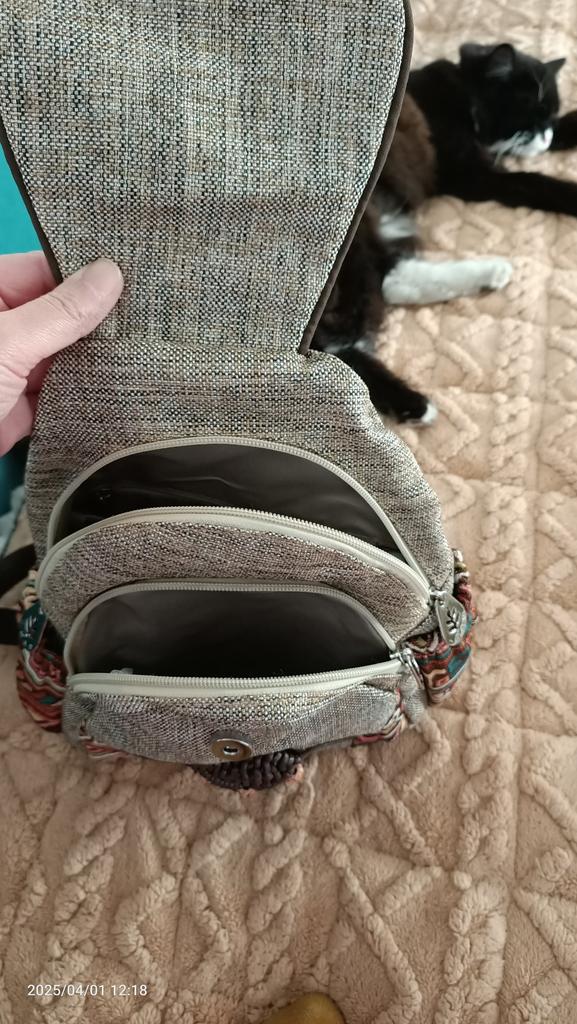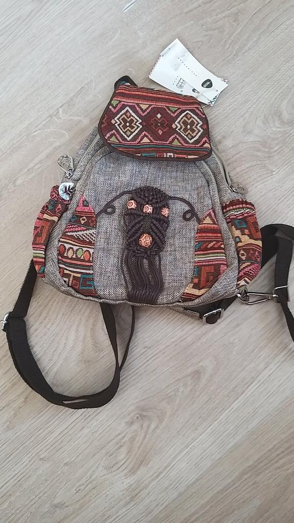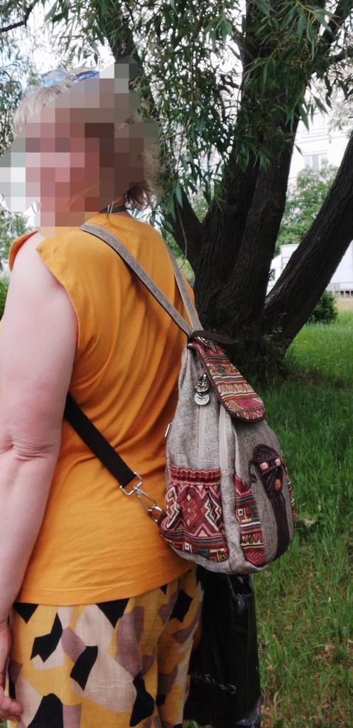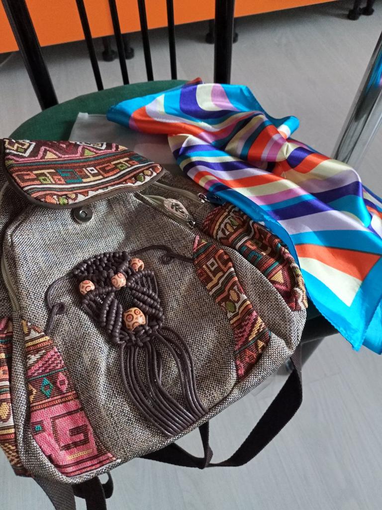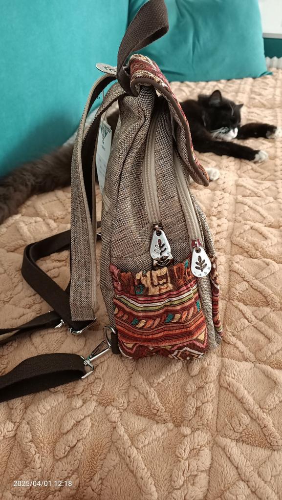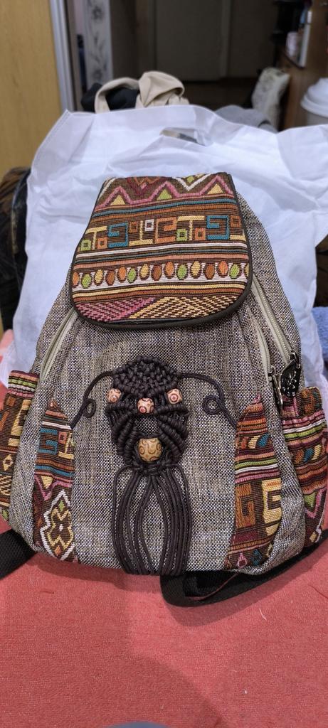 Handmade backpack, roomy, beautiful fabric trim. Two compartments, on the side of the backpack there are pockets for a bottle on both sides. I recommend