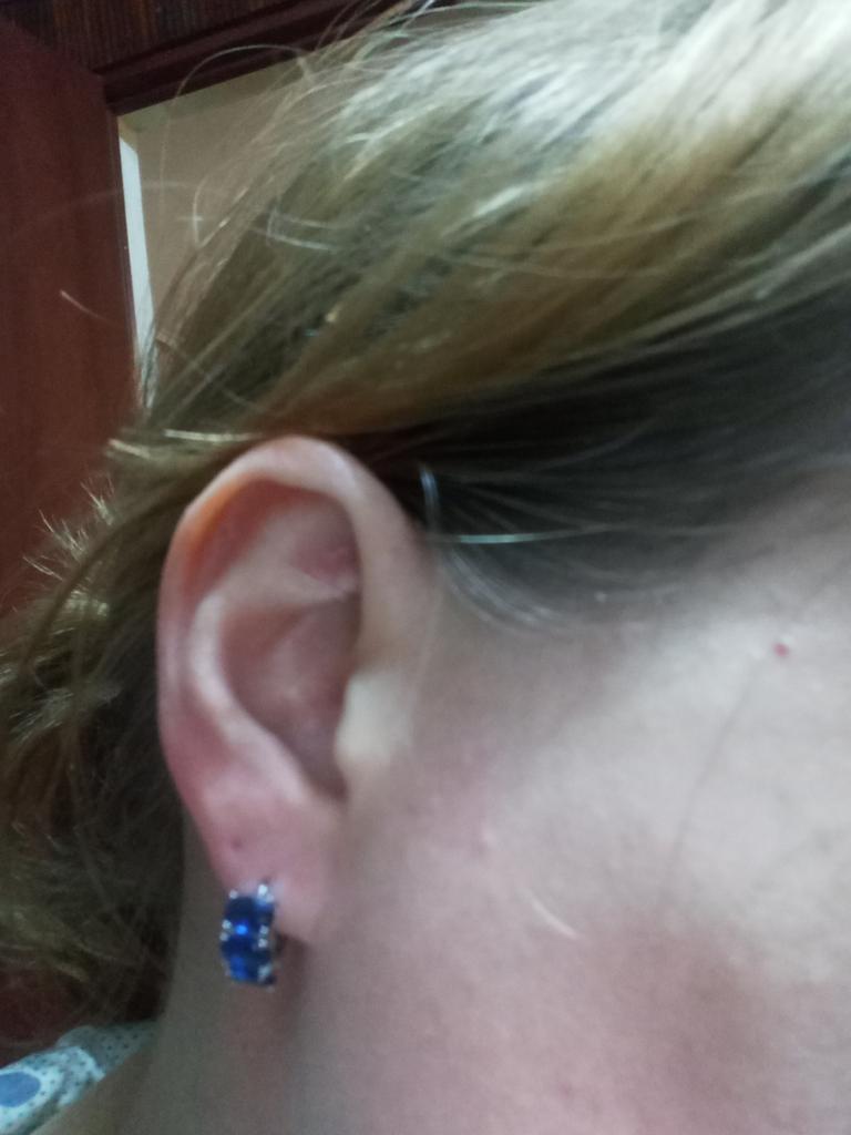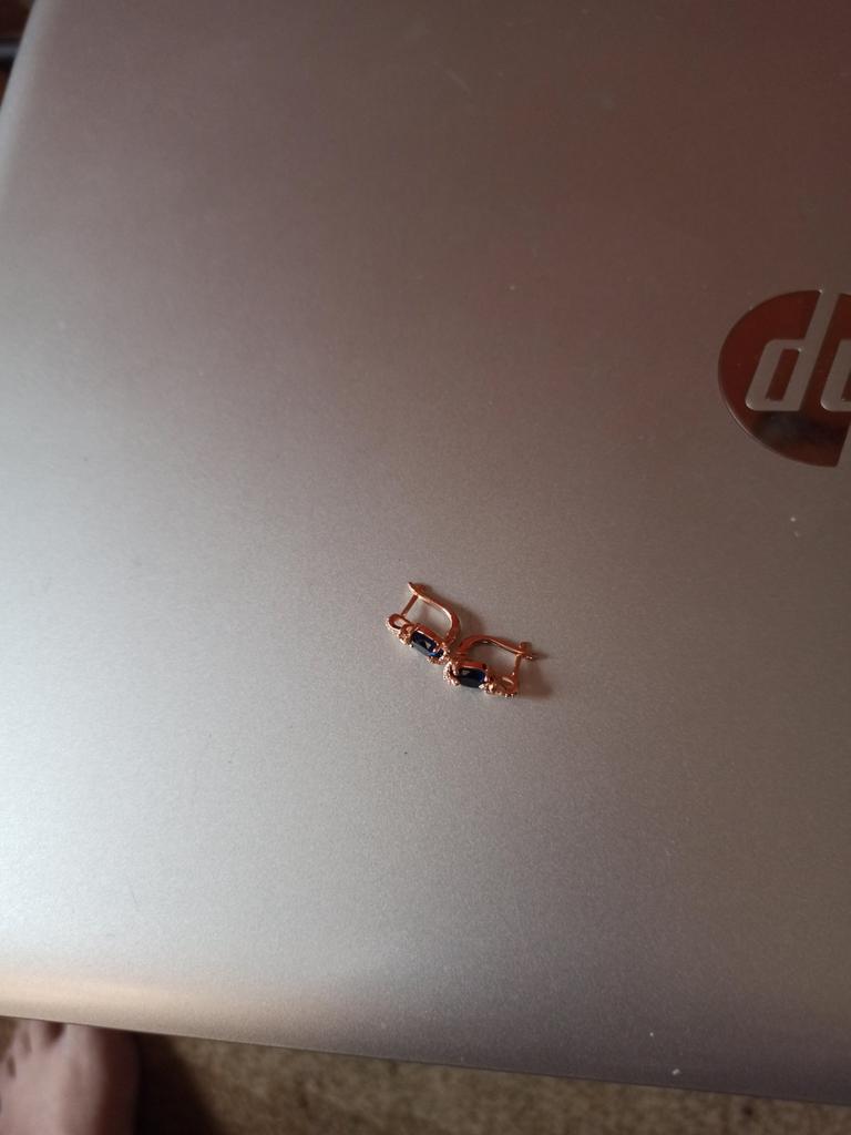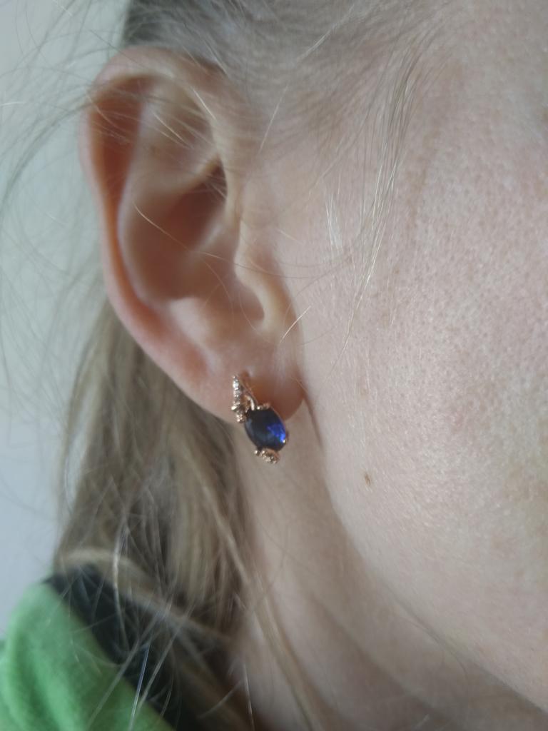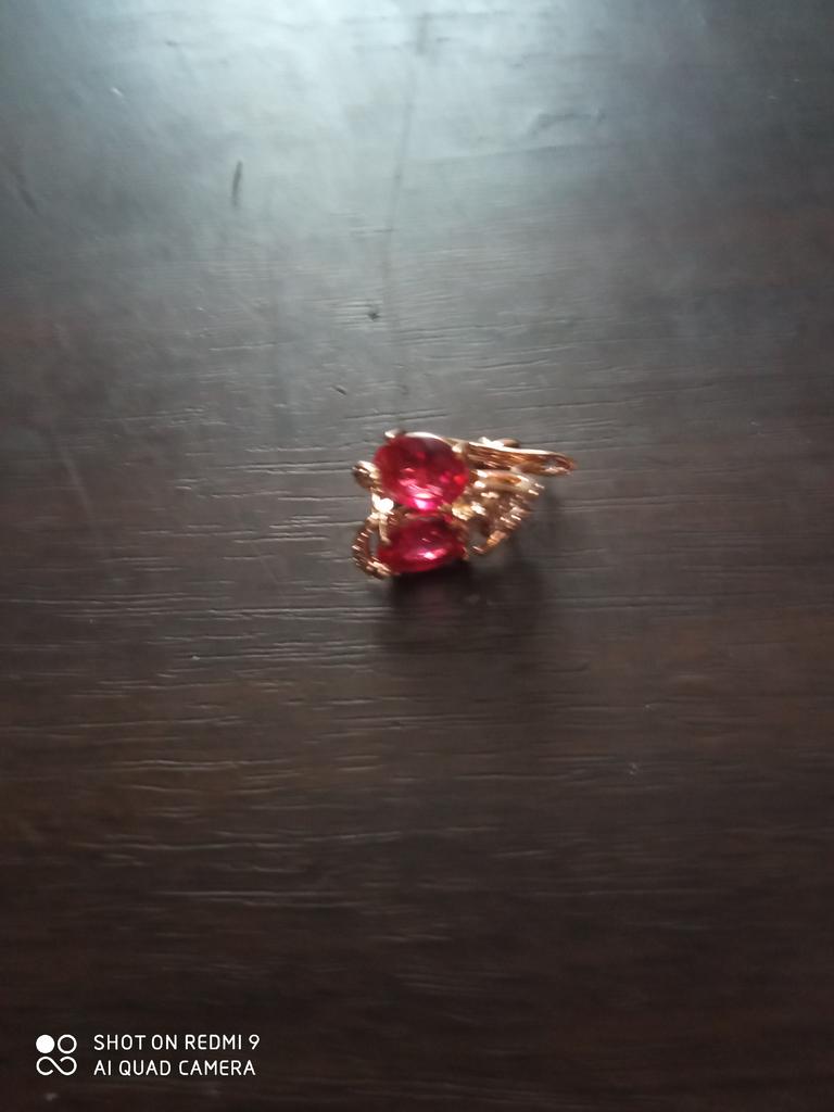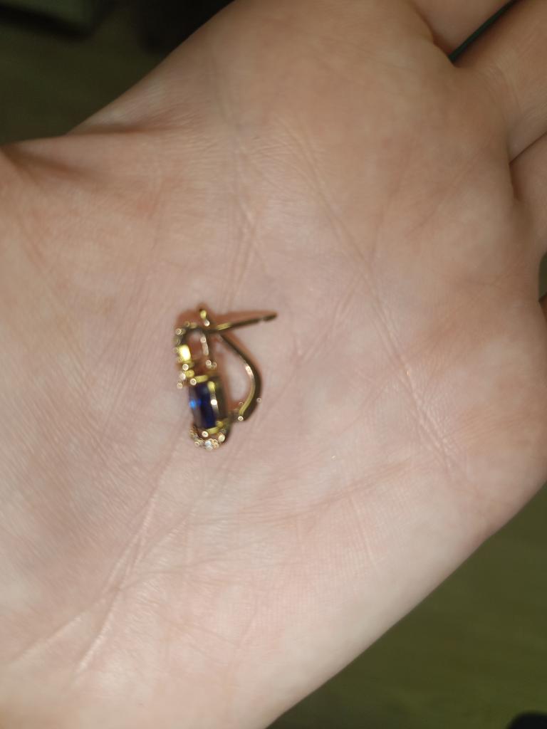 Small, with a blue stone. Gold-colored.
