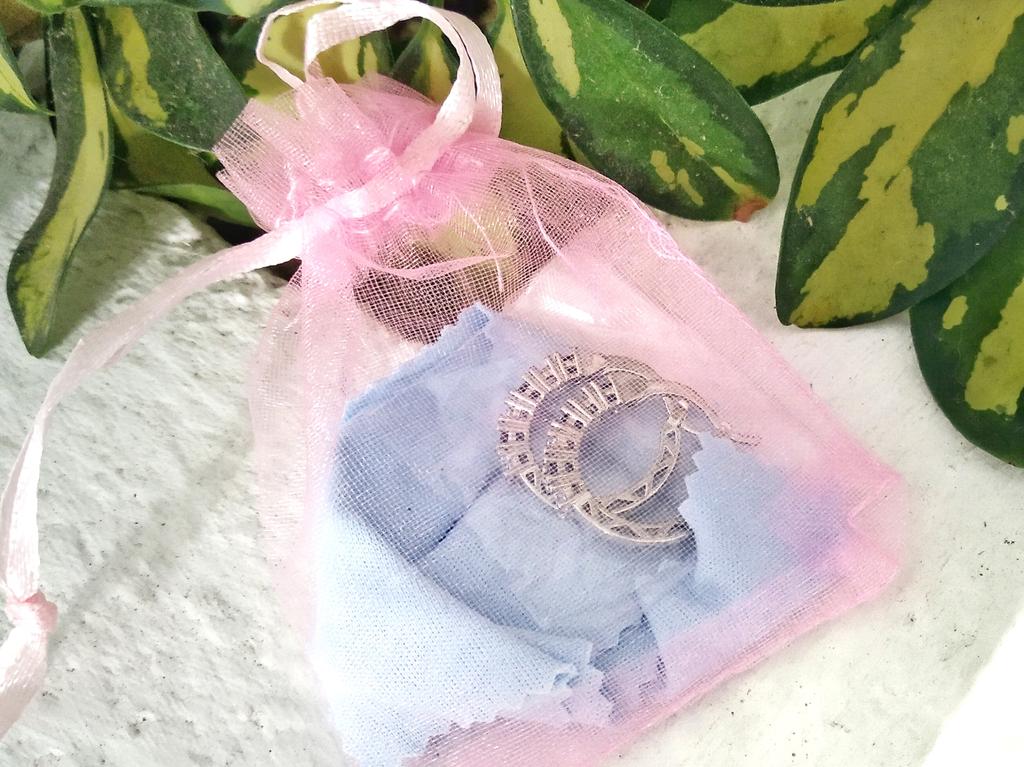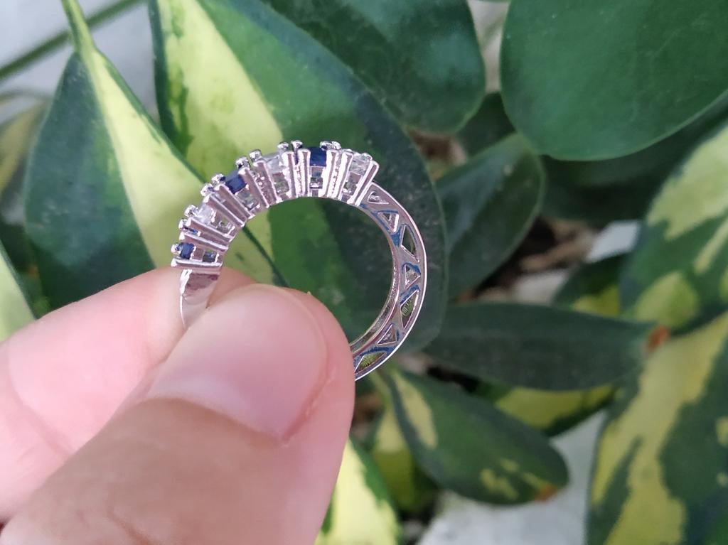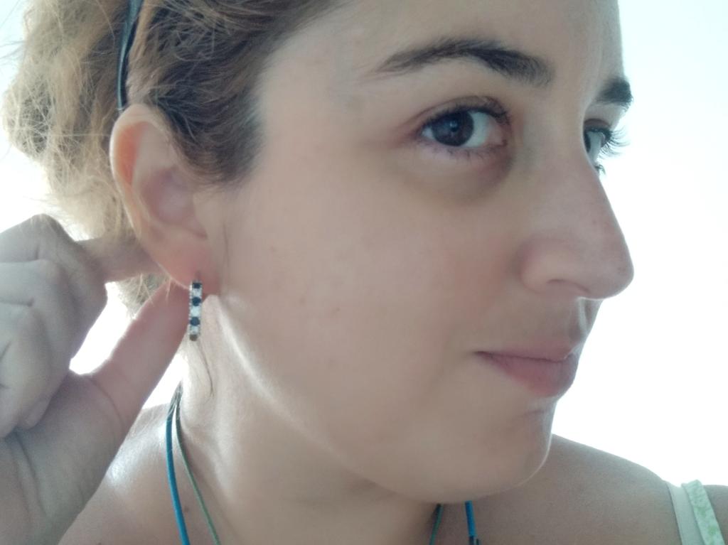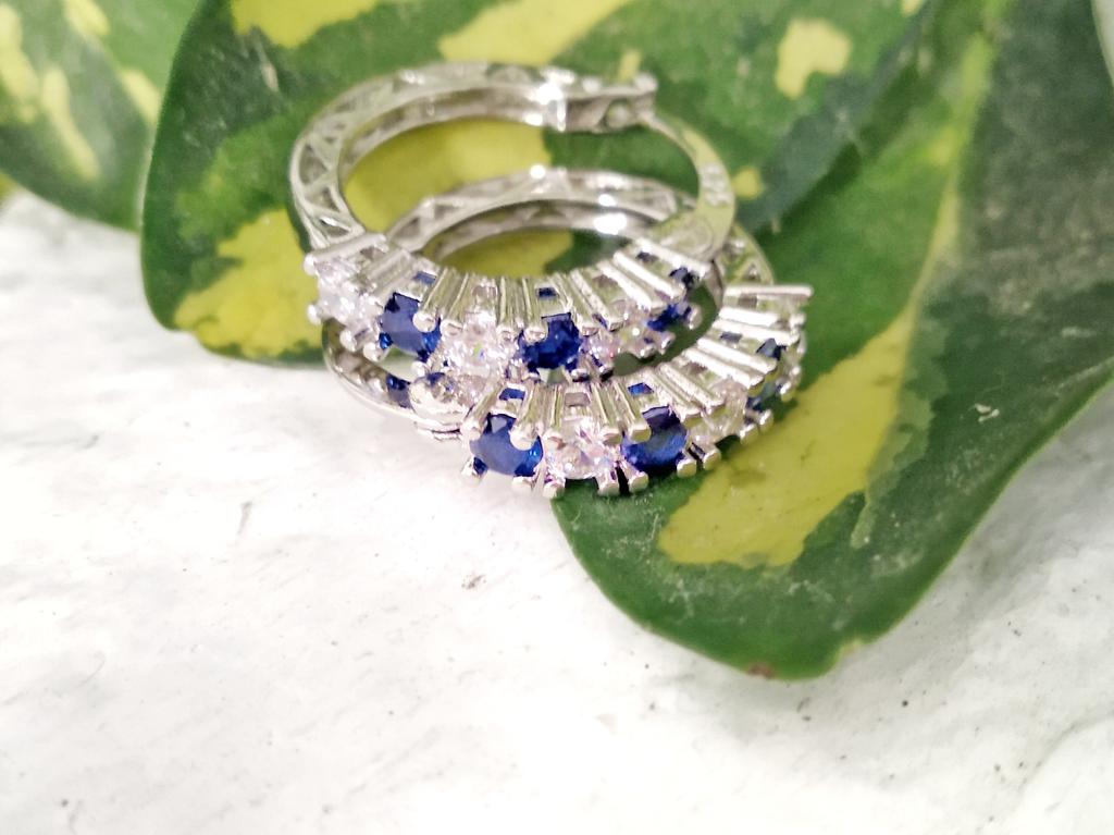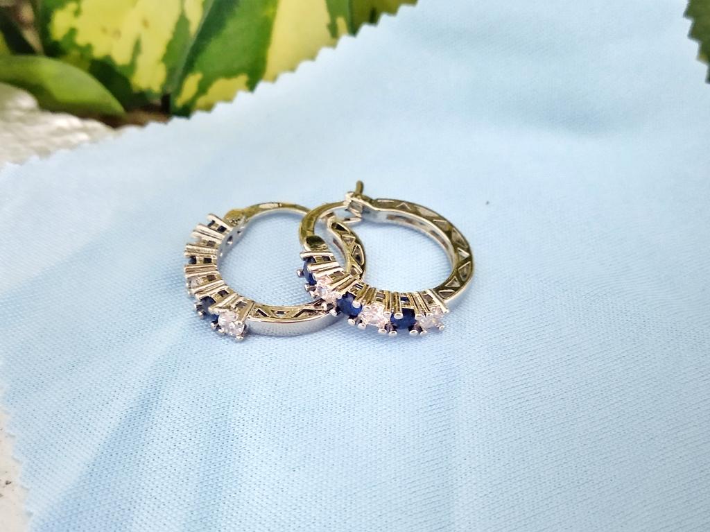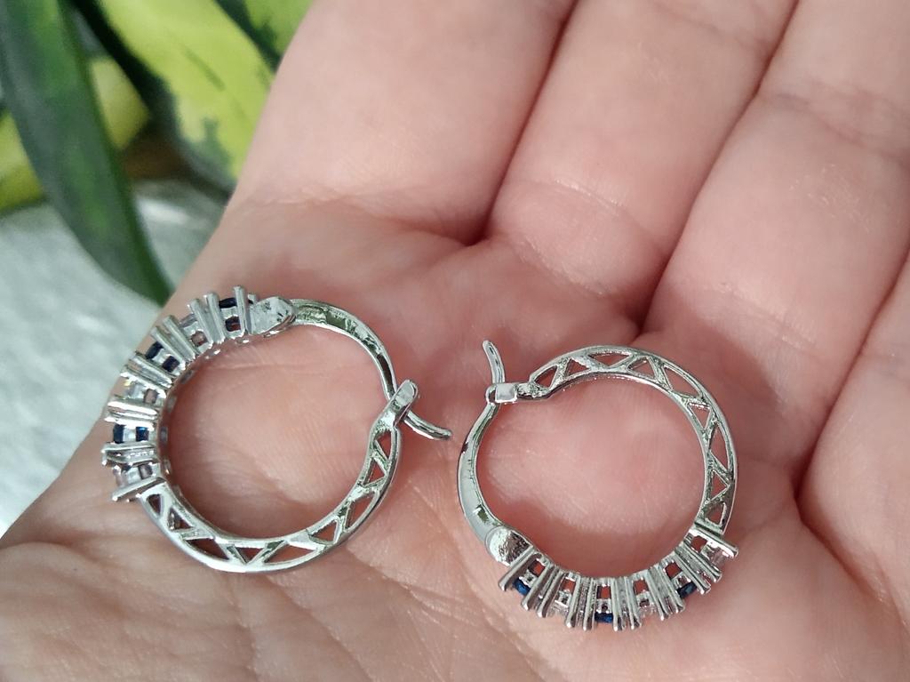 Silver earrings with blue diamonds 💙 These elegant earrings have a rounded shape like small hoops and are decorated with white and blue rhinestones.. They are very elegant, light and comfortable to wear. In addition, the seller sends them in a coquettish way with a pretty pink organza fabric bag and a cotton cloth to clean and preserve them.. The shipment was very fast, I think they are an excellent idea for a Christmas gift.