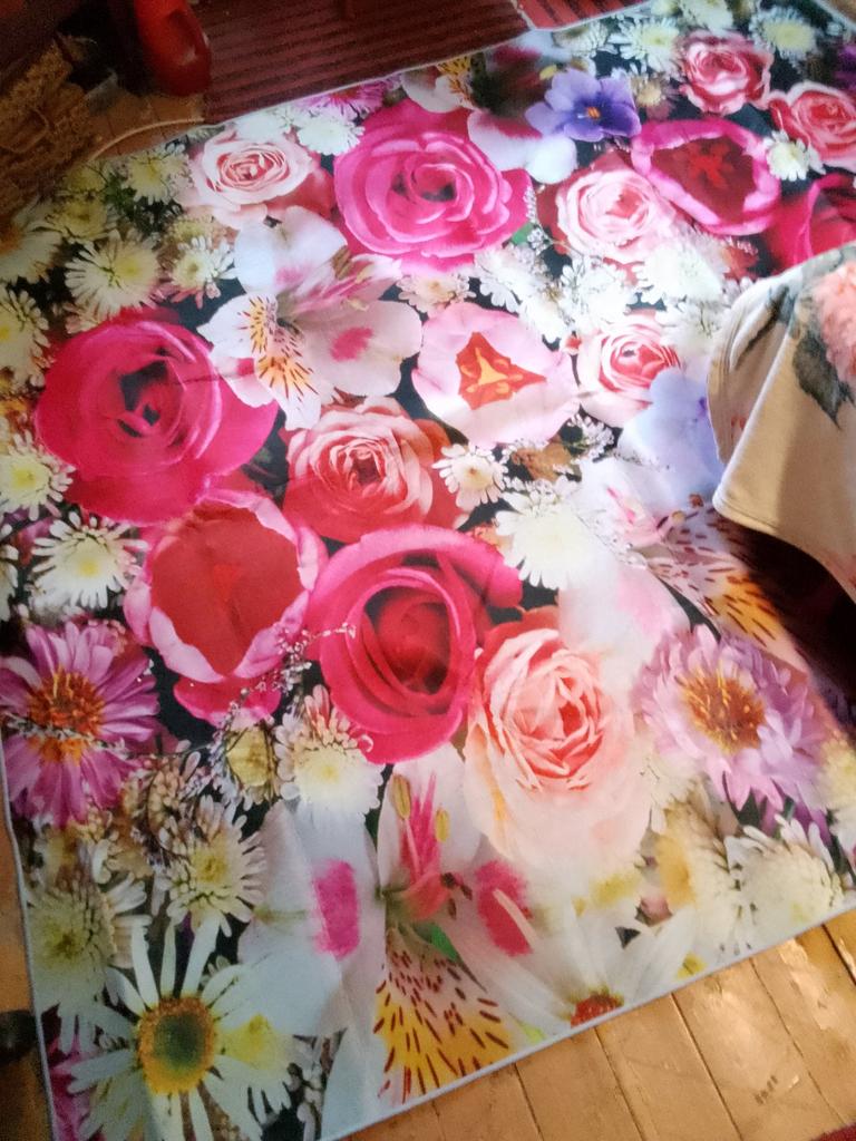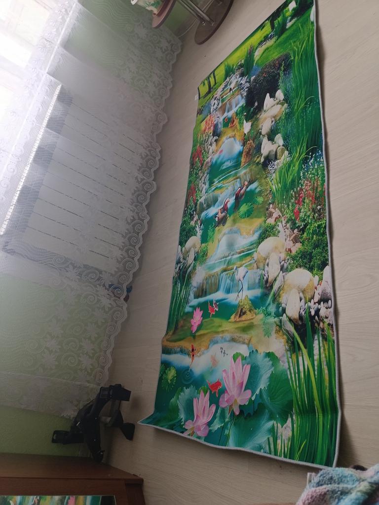 The carpet is thin, easy to wash, but slides on the tiles, the pattern is bright, like in the picture