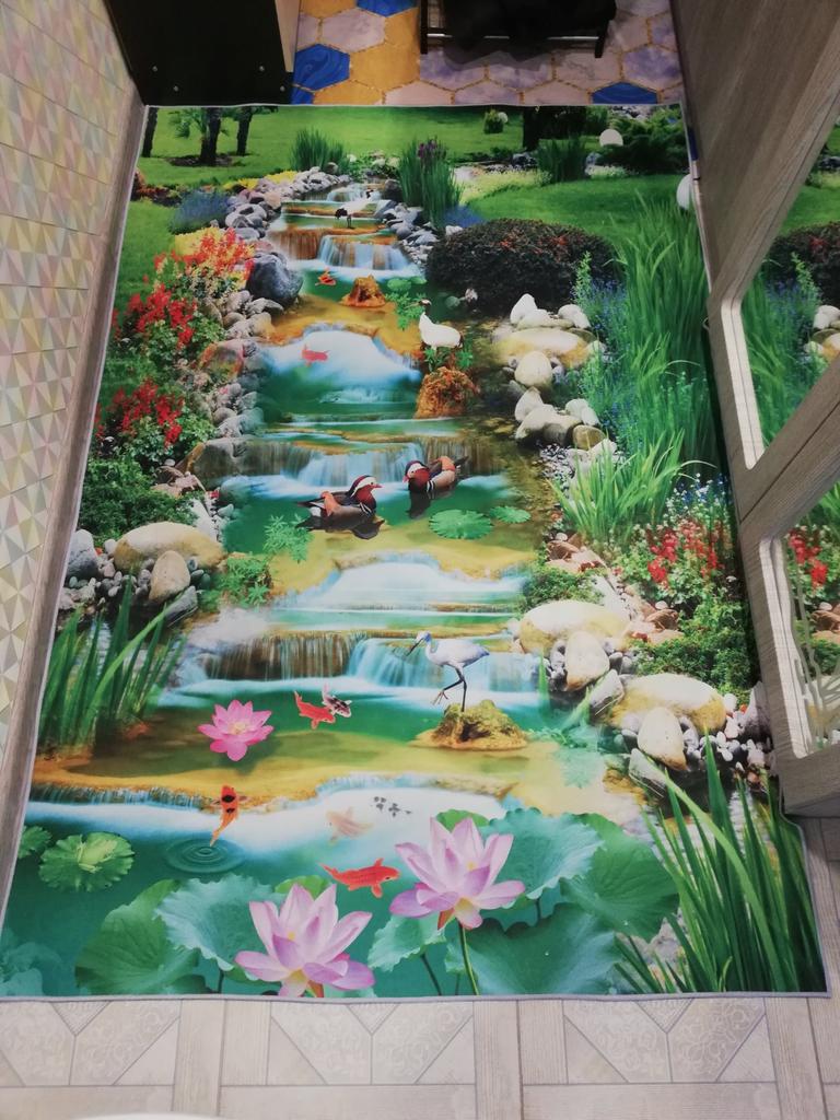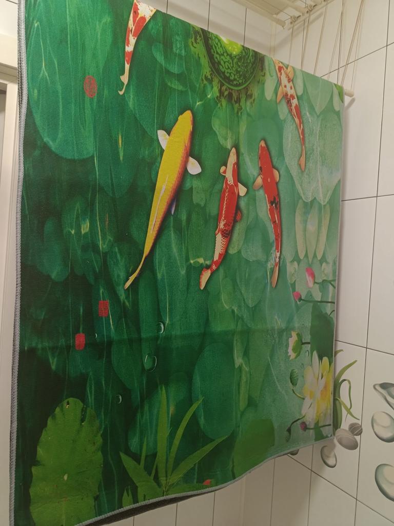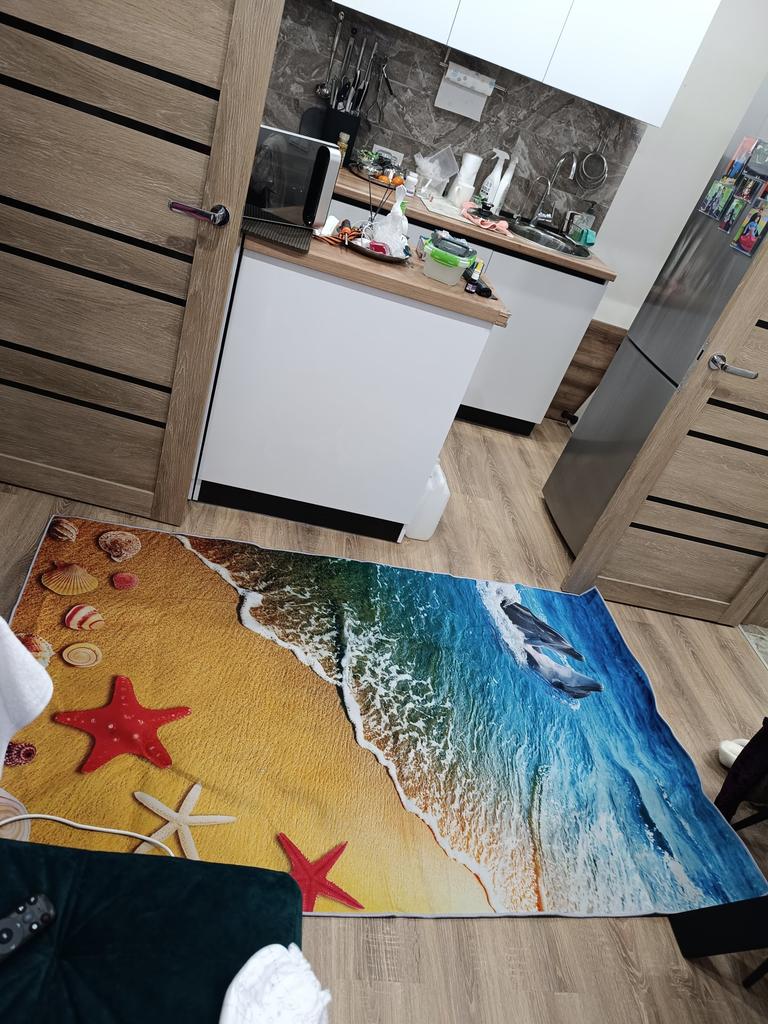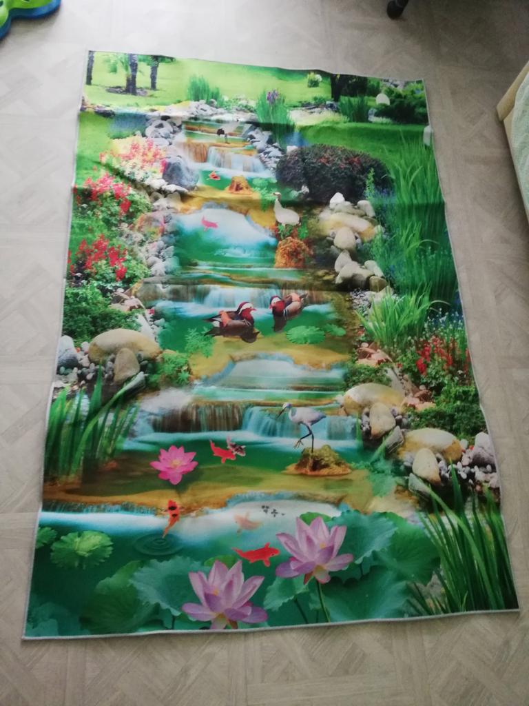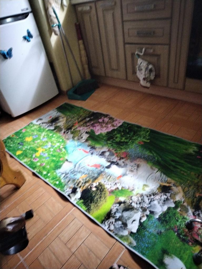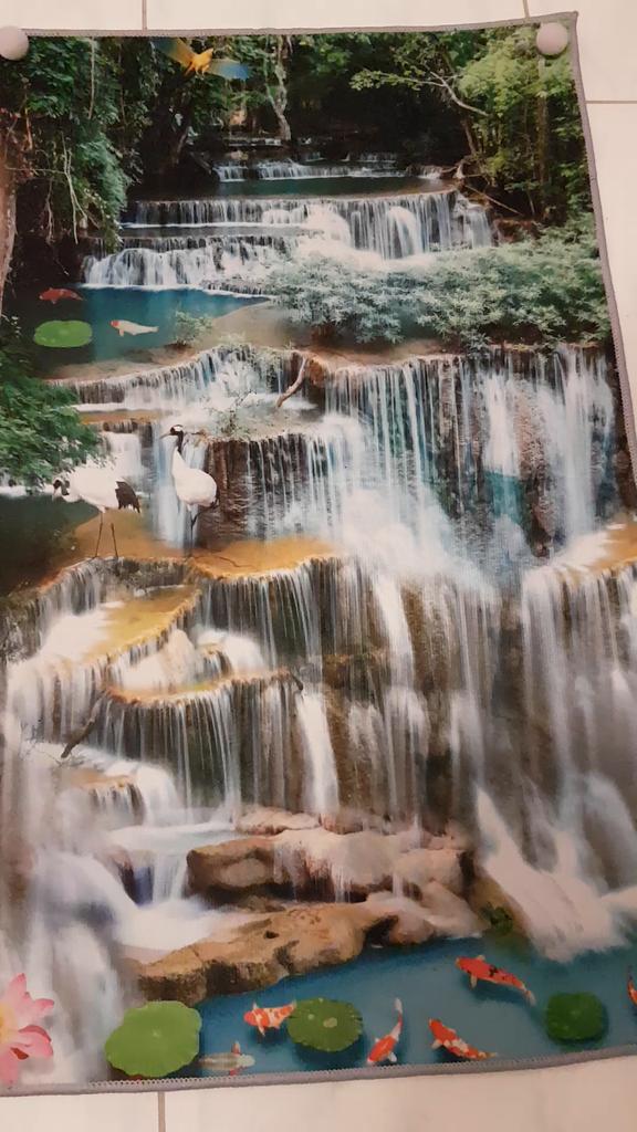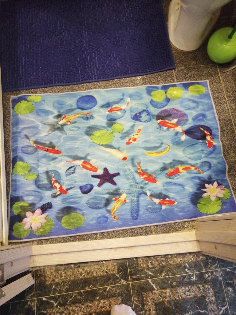 Pretty 3 D floor mat very happy with my purchase 👍 good size very pretty the dolphin pattern 🐬 goes very well for a bathroom 👍 I love dolphins so pretty and clean for a bathroom 🛁 this pattern. Now I have a threshold left to install in front of the door 🚪 to hold the carpet and to make it even prettier 👍 and a perfect finish thanks to the seller and see you 😉