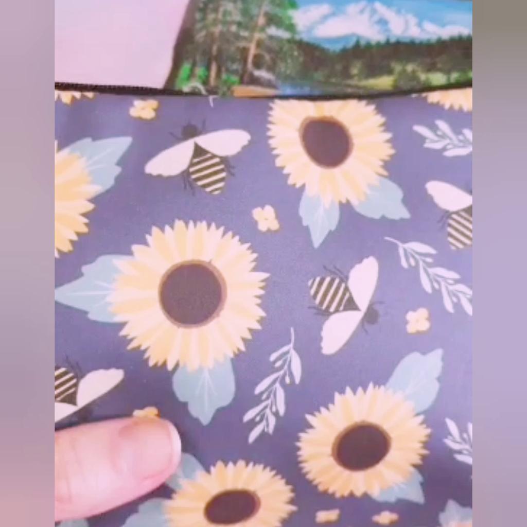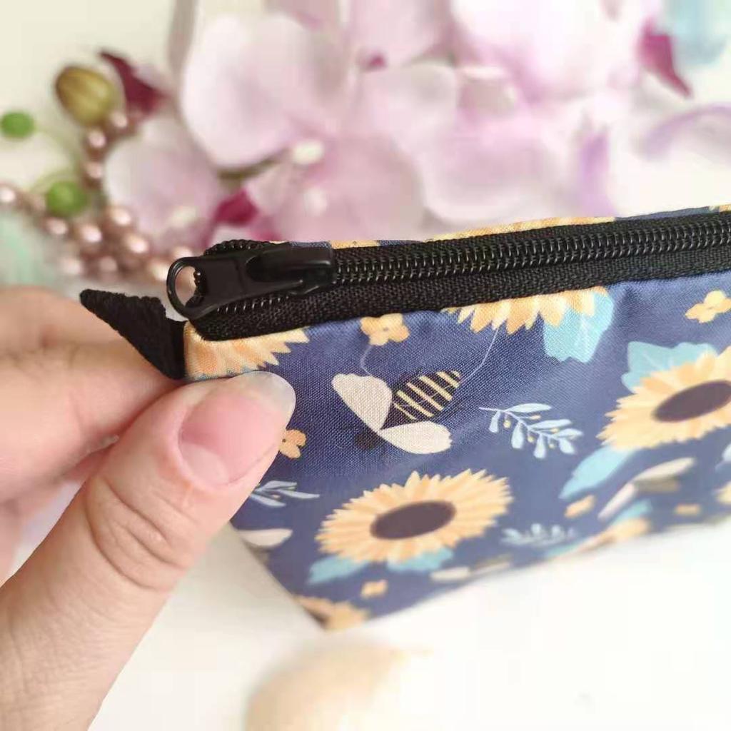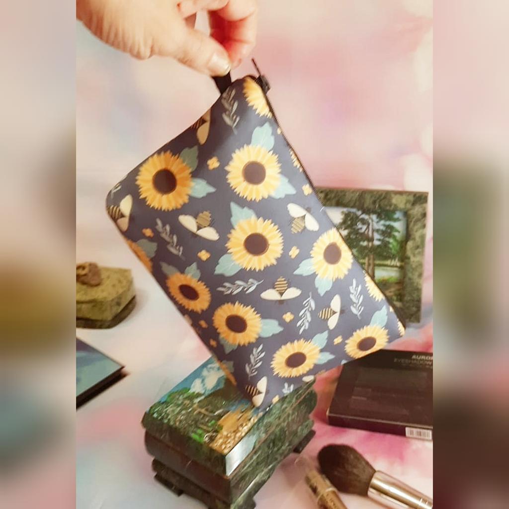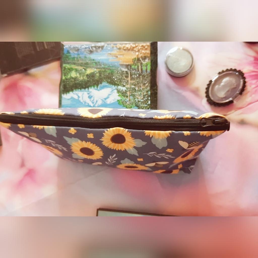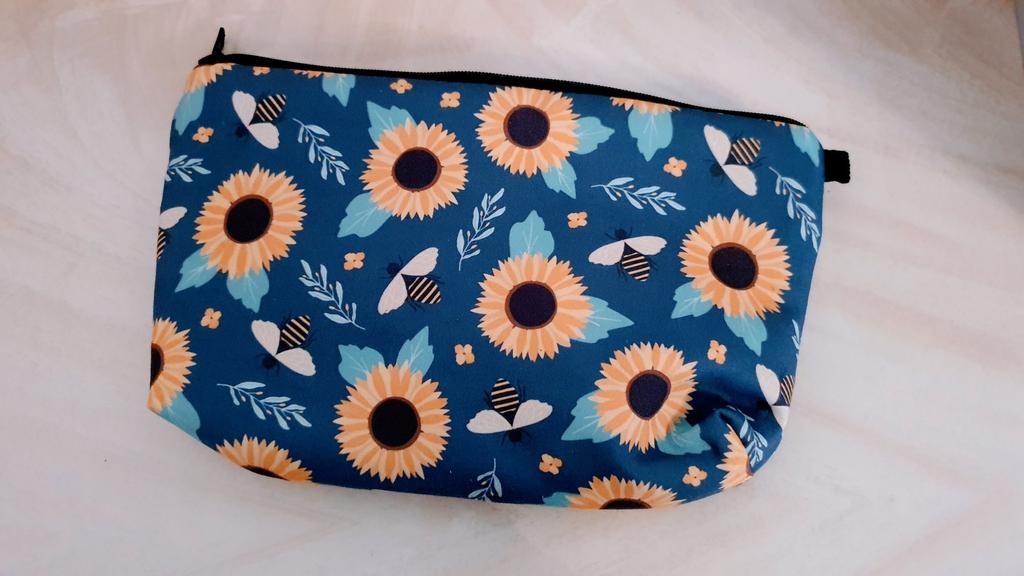 The cosmetic bag with flower print has a length of size 22 cm. The material is made of polyester and has no unpleasant smell. Delivery took 4 weeks and was well packaged.