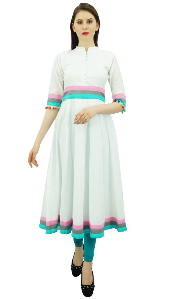 Flared anarkali kurti is designed by Bimba in beautiful pattern for casual or formal occasion. The elegant 3 4th sleeves kurti is made of cotton fabric with solid pattern & pom pom on sleeves. You can wear this for special occasions as well and look amazing.