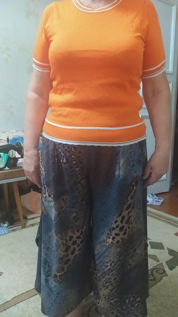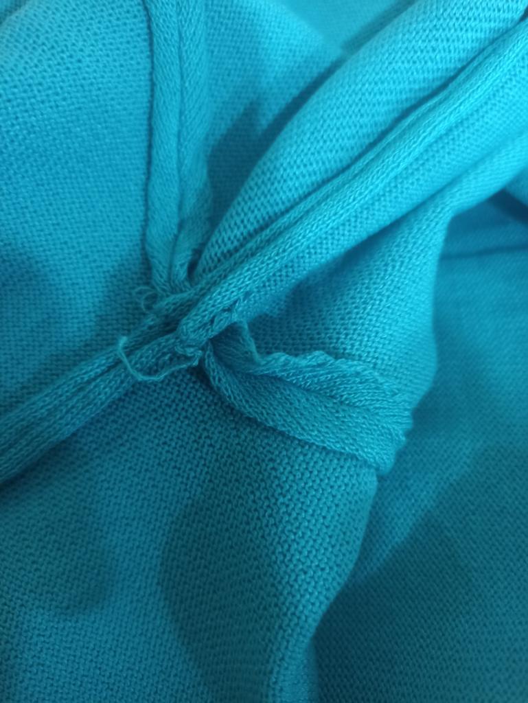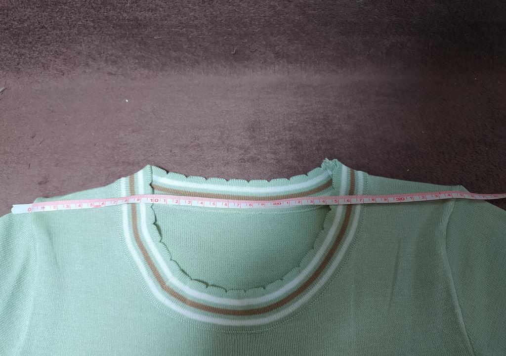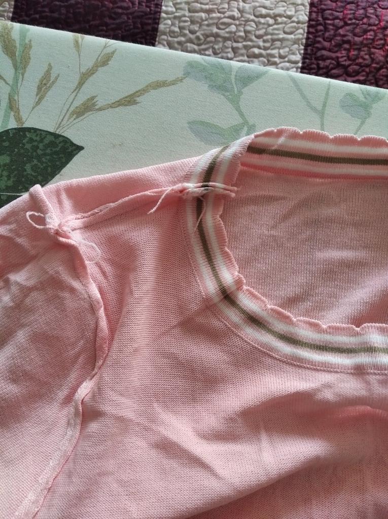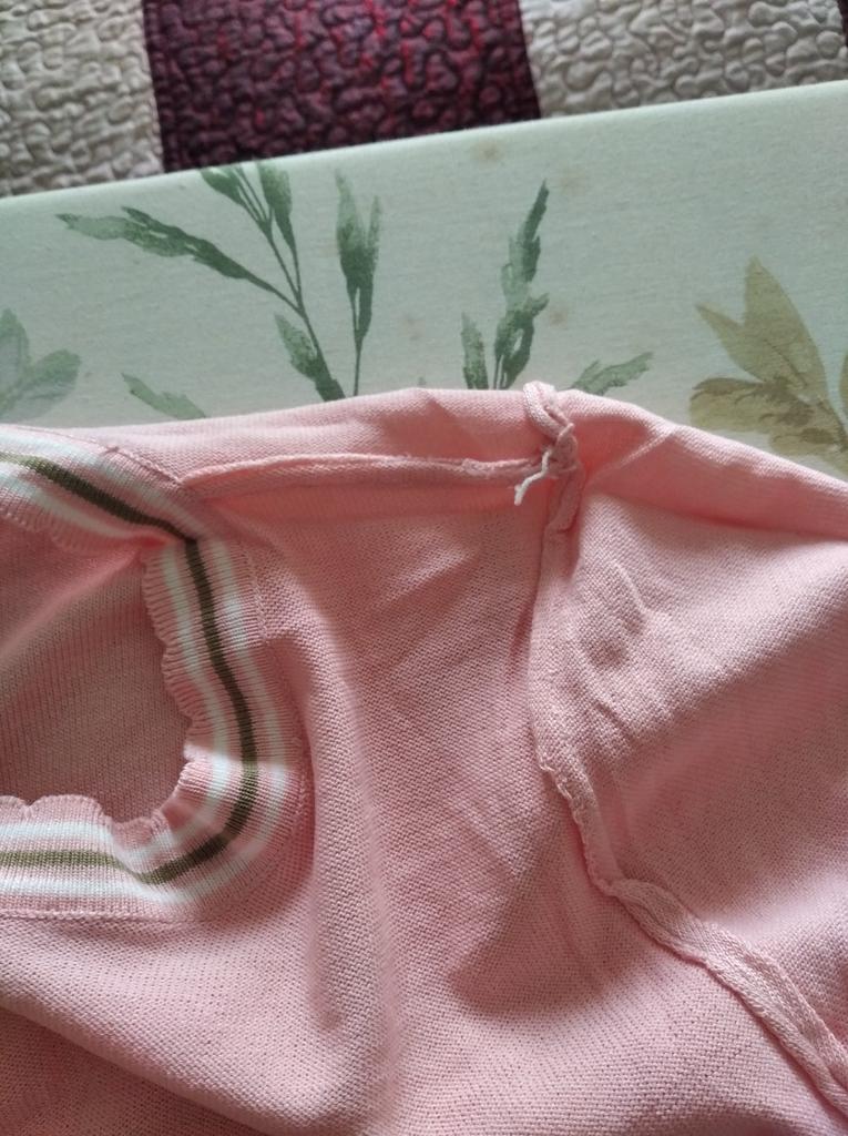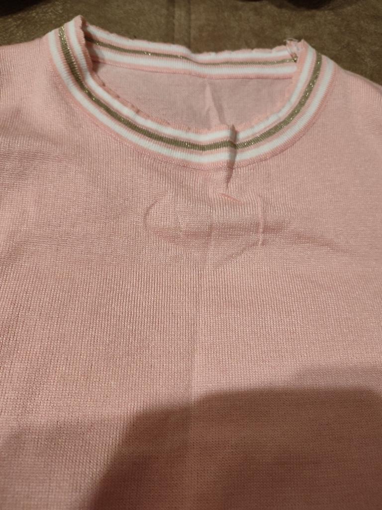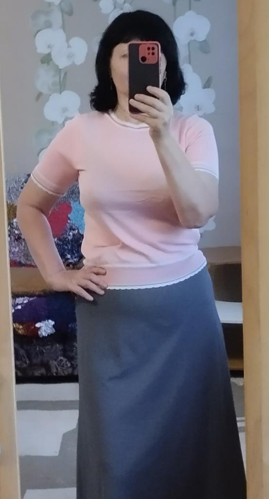 94 gauge is quite loose, very stretchy, each knit stitch ends with threads that hang outward. The neck in the shoulder seam did not fit, it is necessary to adjust the shoulder seam a little.