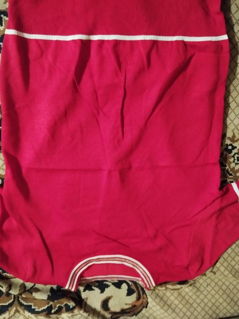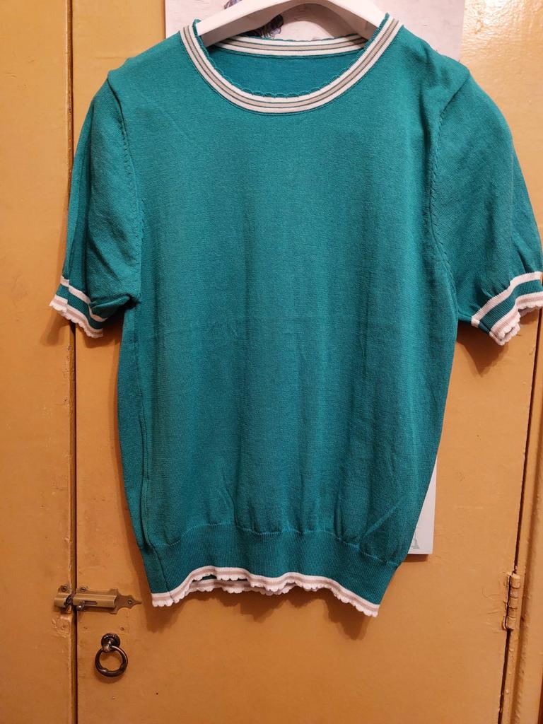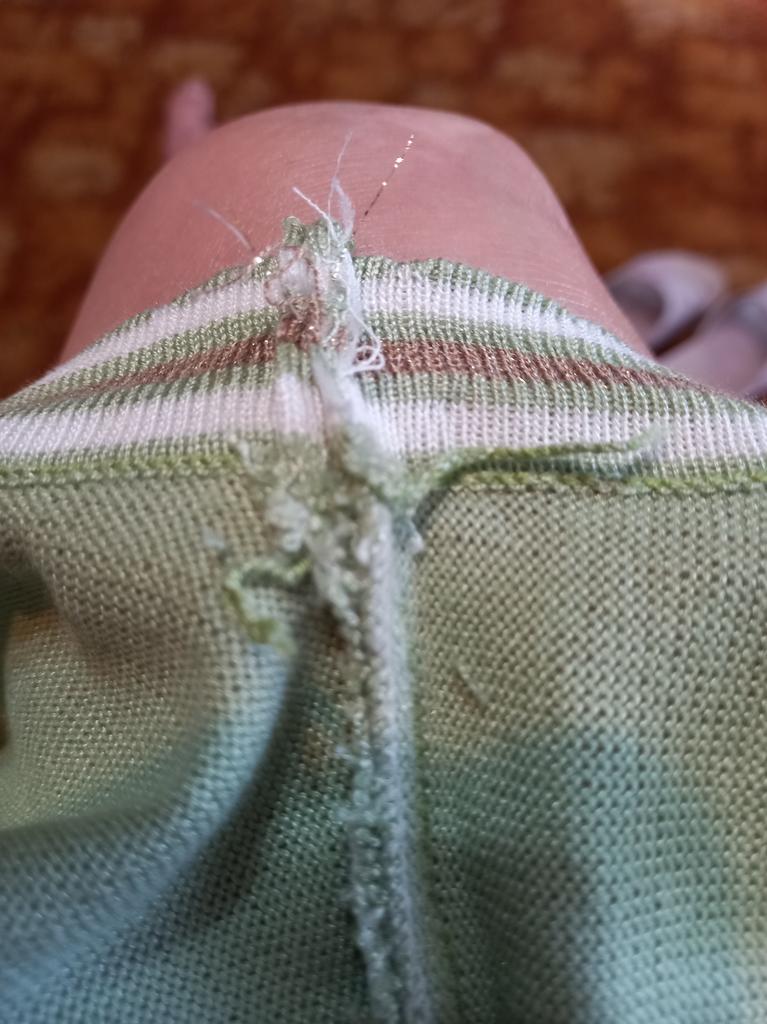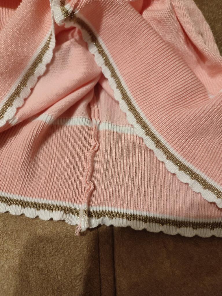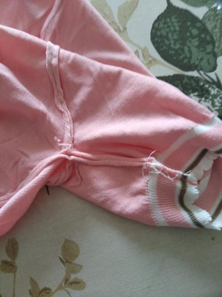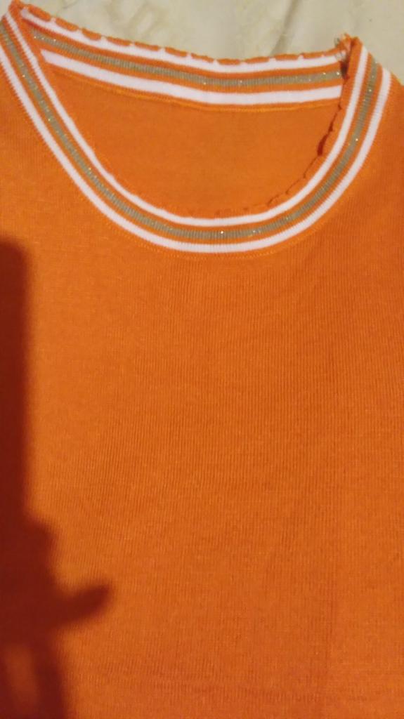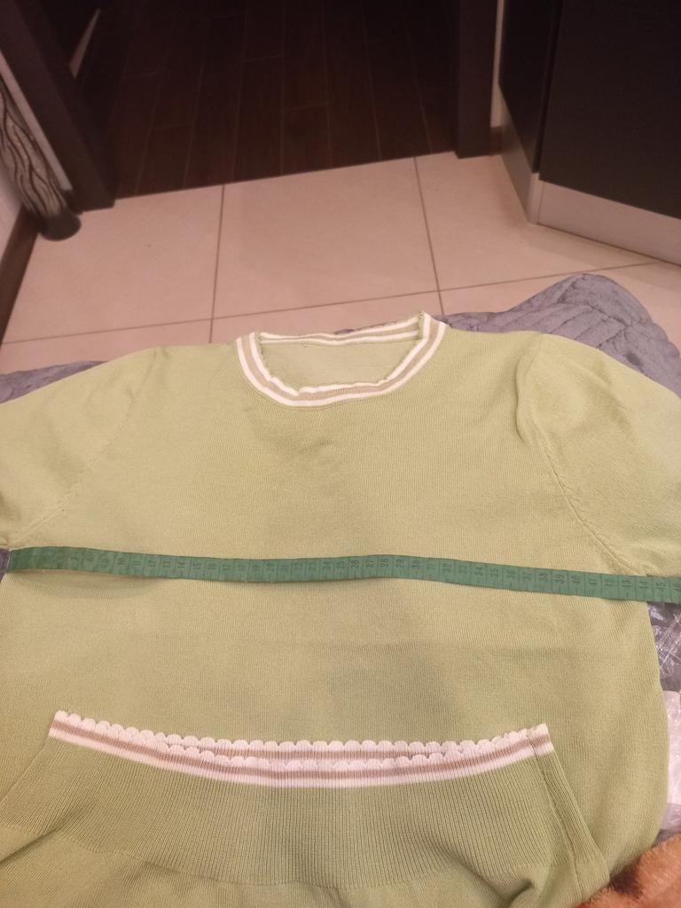 94 gauge is quite loose, very stretchy, each knit stitch ends with threads that hang outward. The neck in the shoulder seam did not fit, it is necessary to adjust the shoulder seam a little.