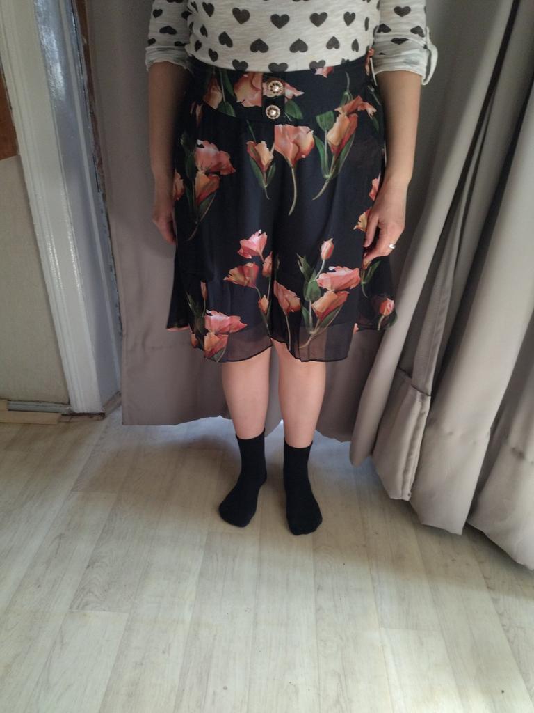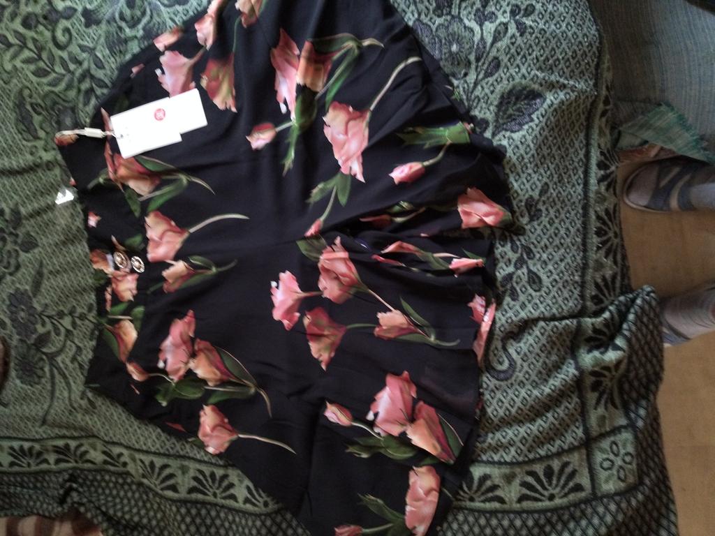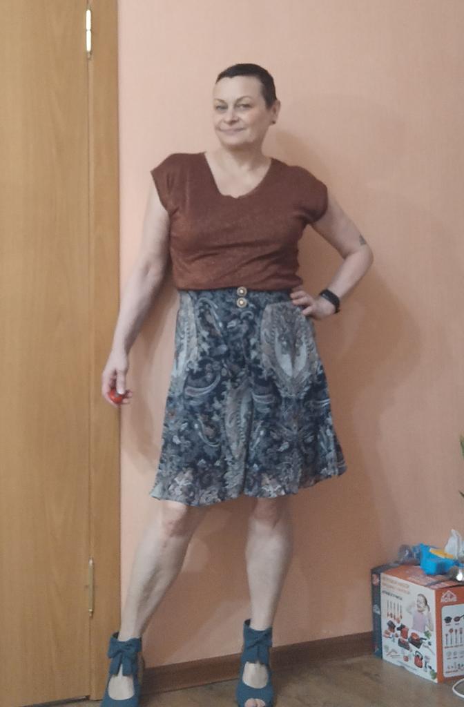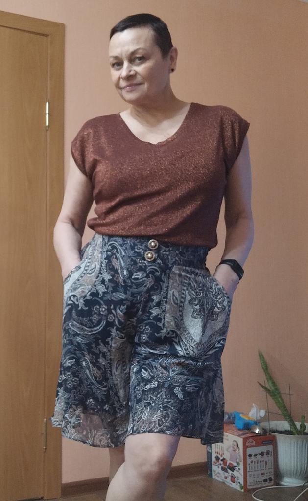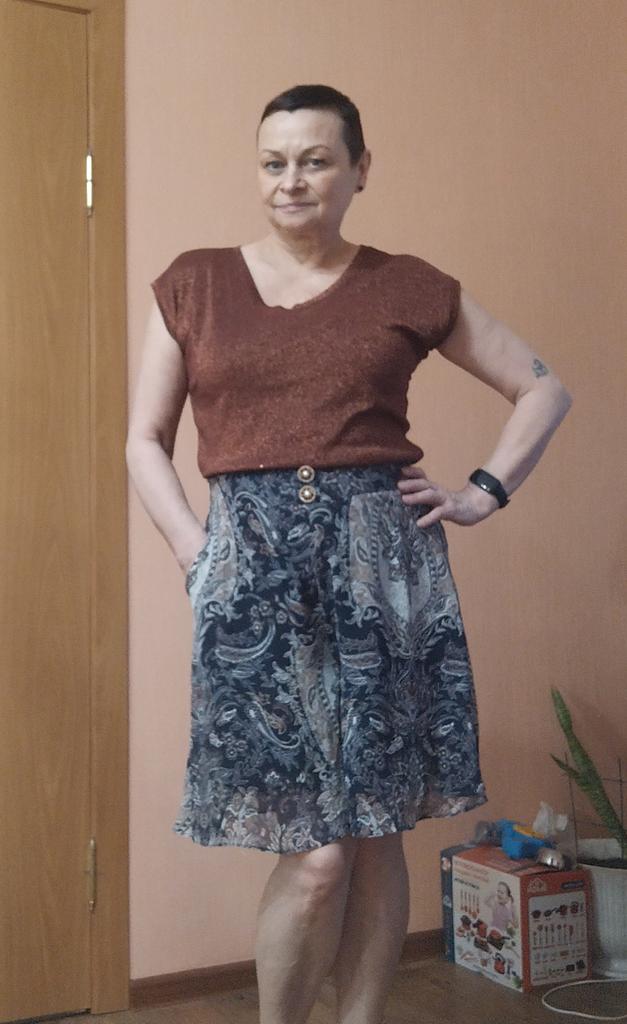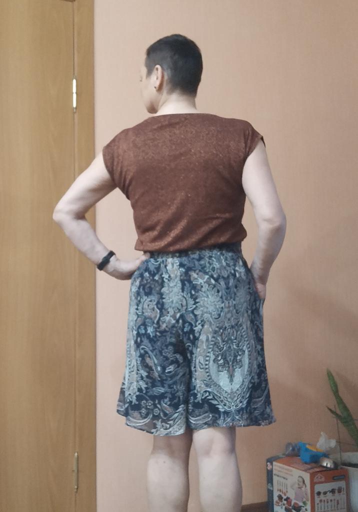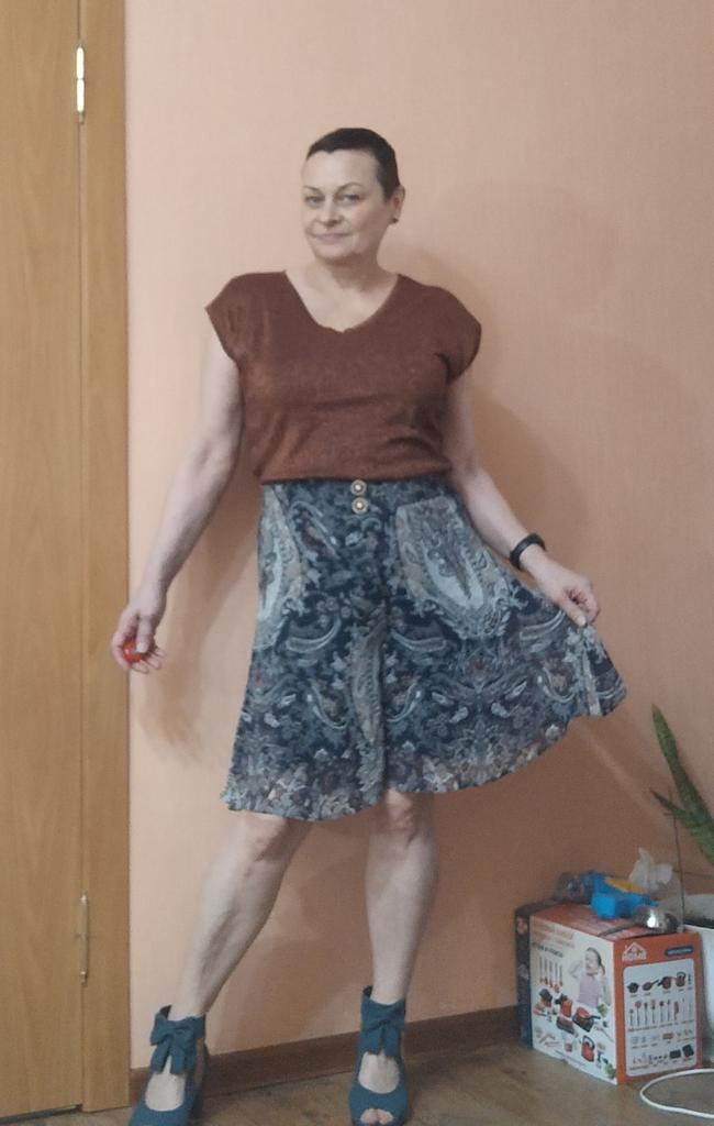 Large, flared at the waist. I will think how to sew. In the photo, the pattern of the fabric looks more gentle. All in all, good for summer. Has lining and pockets.