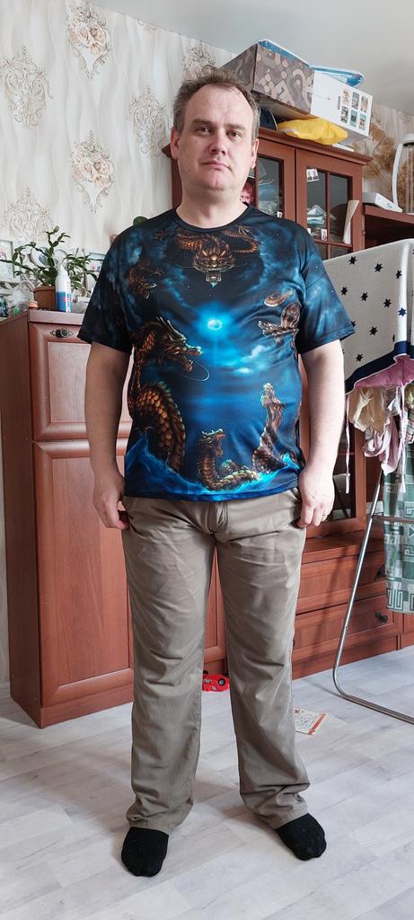 I'm delighted with the T-shirt. And the print, and the size, and the quality. I am not attaching a photo, as I gave it as a gift immediately after receiving the parcel.