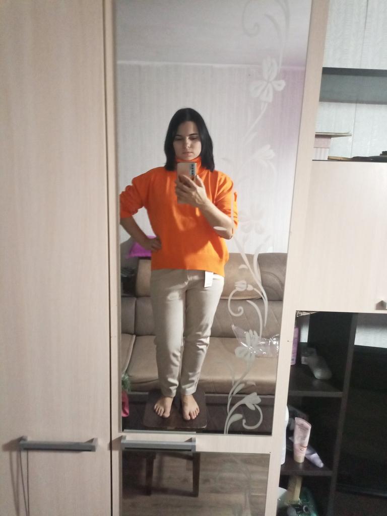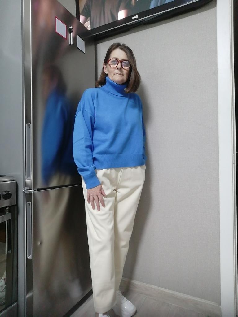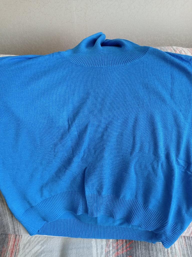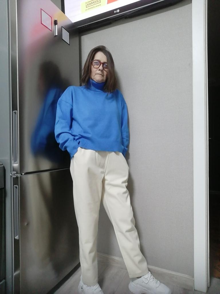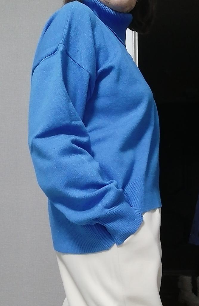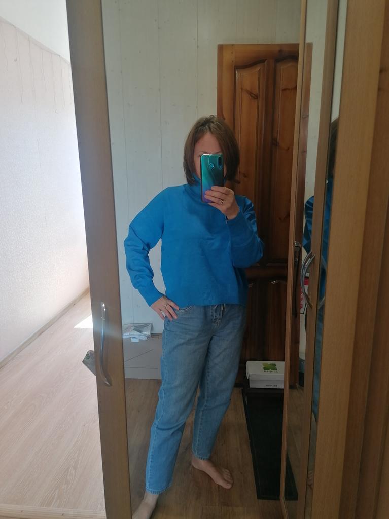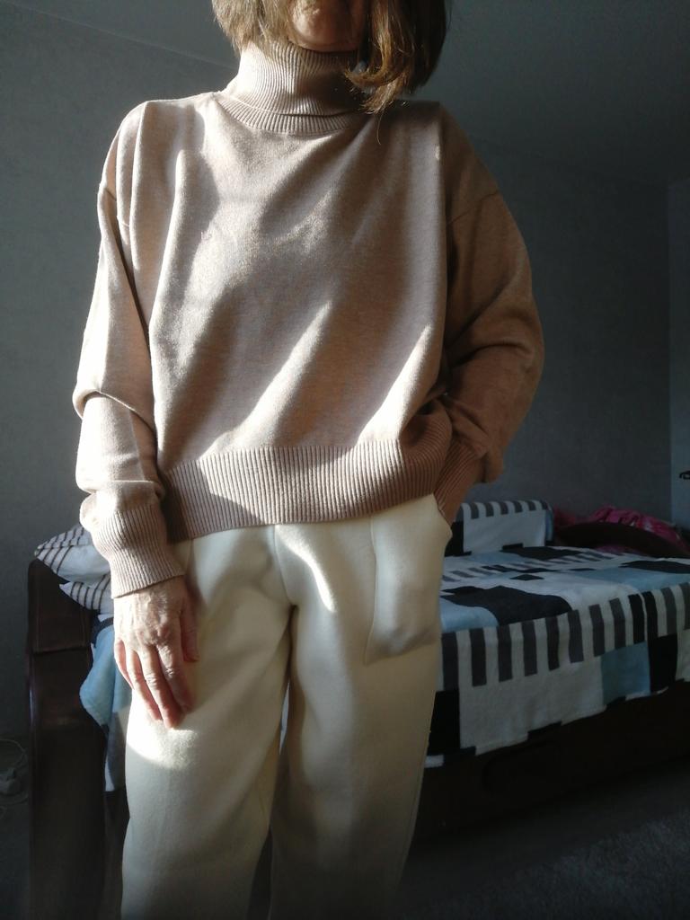 One of the advantages of the sweater is that it is a very beautiful color. I didn't like everything else Very thick knitwear, does not fit the figure The collar is high, it presses The style is unsuccessful - wide and short