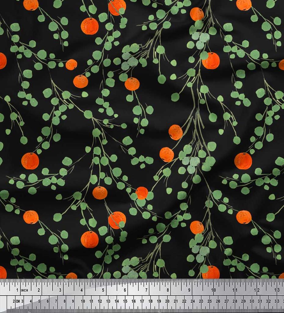 Soimoi Black Japan Crepe Satin Fabric Leaves & Orange Fruits Print Fabric by Metre 42 Inch