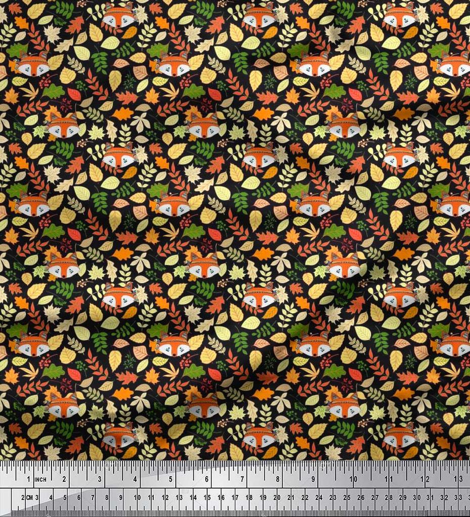 Soimoi Japan Crepe Satin Fabric Leaves & Fox Face Cartoon Printed Craft Fabric by the Metre 42 Inch