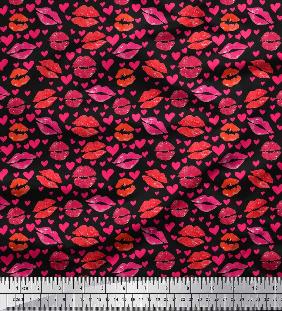 Soimoi Black Japan Crepe Satin Fabric Heart & Lips Women Print Fabric by the Metre 42 Inch