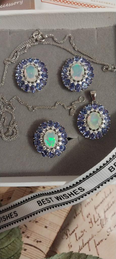 Luxury Party Silver Jewelry Set Natural Opal Oval 7*9mm Blue Tanzanite Clasp Earring Gemstone Rings 925 Sterling Silver for Women Wife Nice Gift
