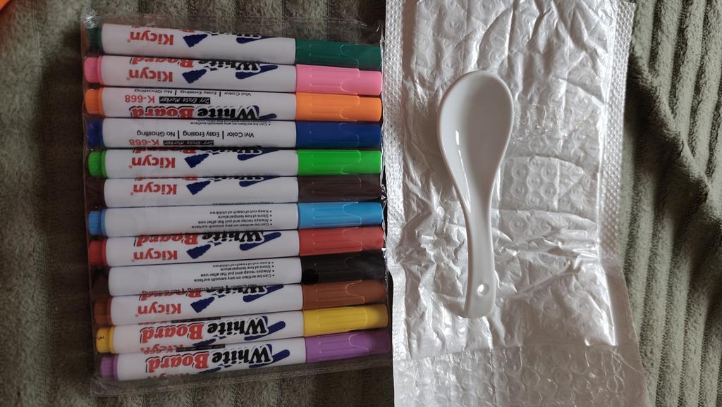 The spoon was broken. But the markers worked well for drawing on a smooth surface and erasing.
