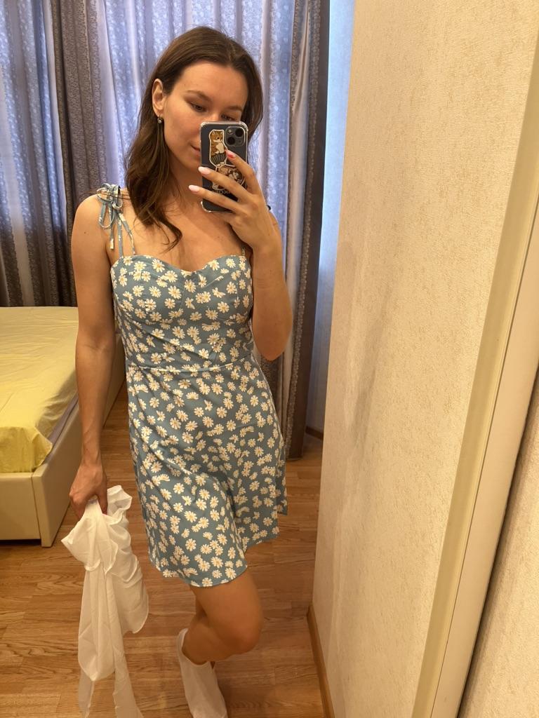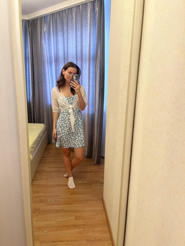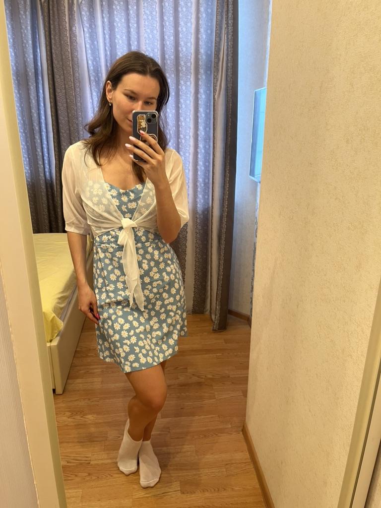 Nice dress and light shirtโจ I will say right away that the dress turned out to be too big for me๐ On my parameters 80.57.89, the dress is simply huge. My height is 175 cm The fabric is pleasant, a beautiful daisy pattern, mountain seams. Only the neckline is sewn very poorly, there is absolutely no shape, that's why I took away one star. Overall a good dress, but not for me unfortunately