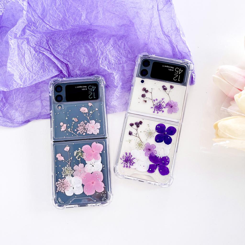 For Samsung Galaxy Z Flip 4 3 Flip4 Case Transparent Glitter Real Flower Clear Shockproof Protective Hard Back Cover Accessories